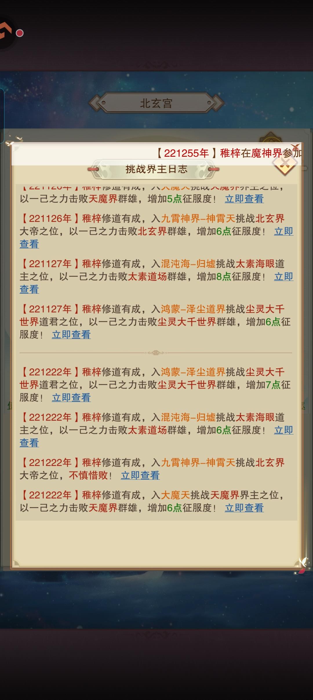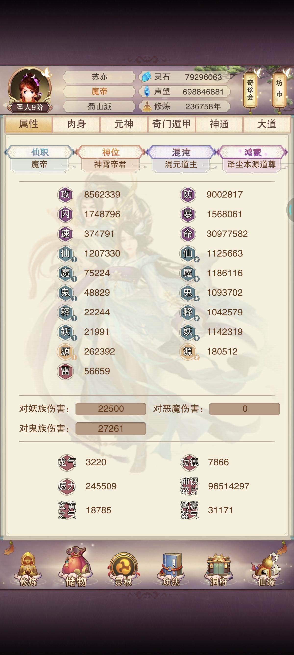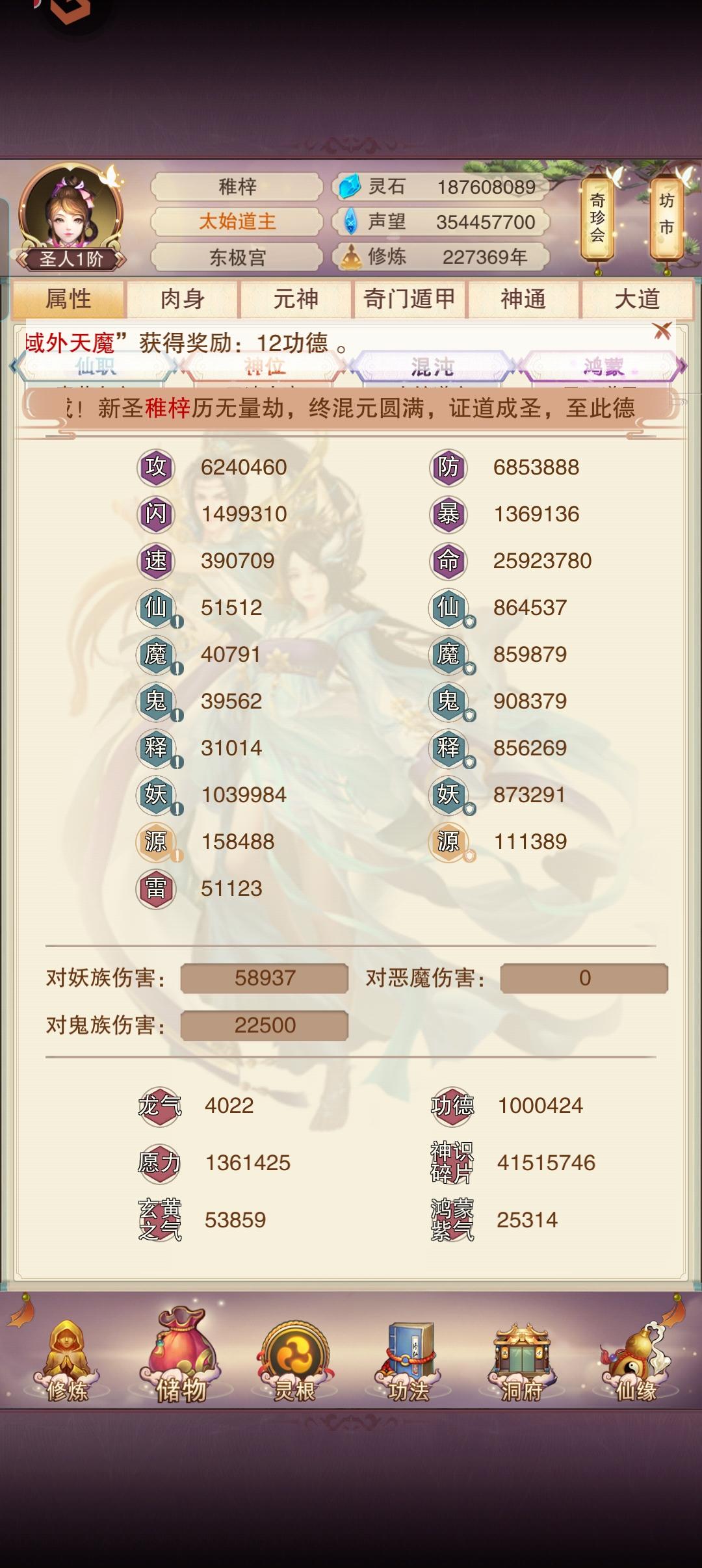 玩了4年了,感觉就剩个成圣的执念了,估计到圣人阶段就坐化了。 14万年了,这一万年攻击增加64万,防御增加71万,提高还是蛮大的,主要是因为点化了不少道果和附灵到了11级。修为也快到准圣9了,用营地算了一下,16万年前想成圣估计够呛。神通能刷的都学了,还剩50多个空缺等法会慢慢磨吧。混沌海马上进最后一个图了,鸿蒙也进了紫羽,火域的饼吃完,混沌法宝也祭炼到顶了。下一万年主要弄宠物血脉,等有劲了