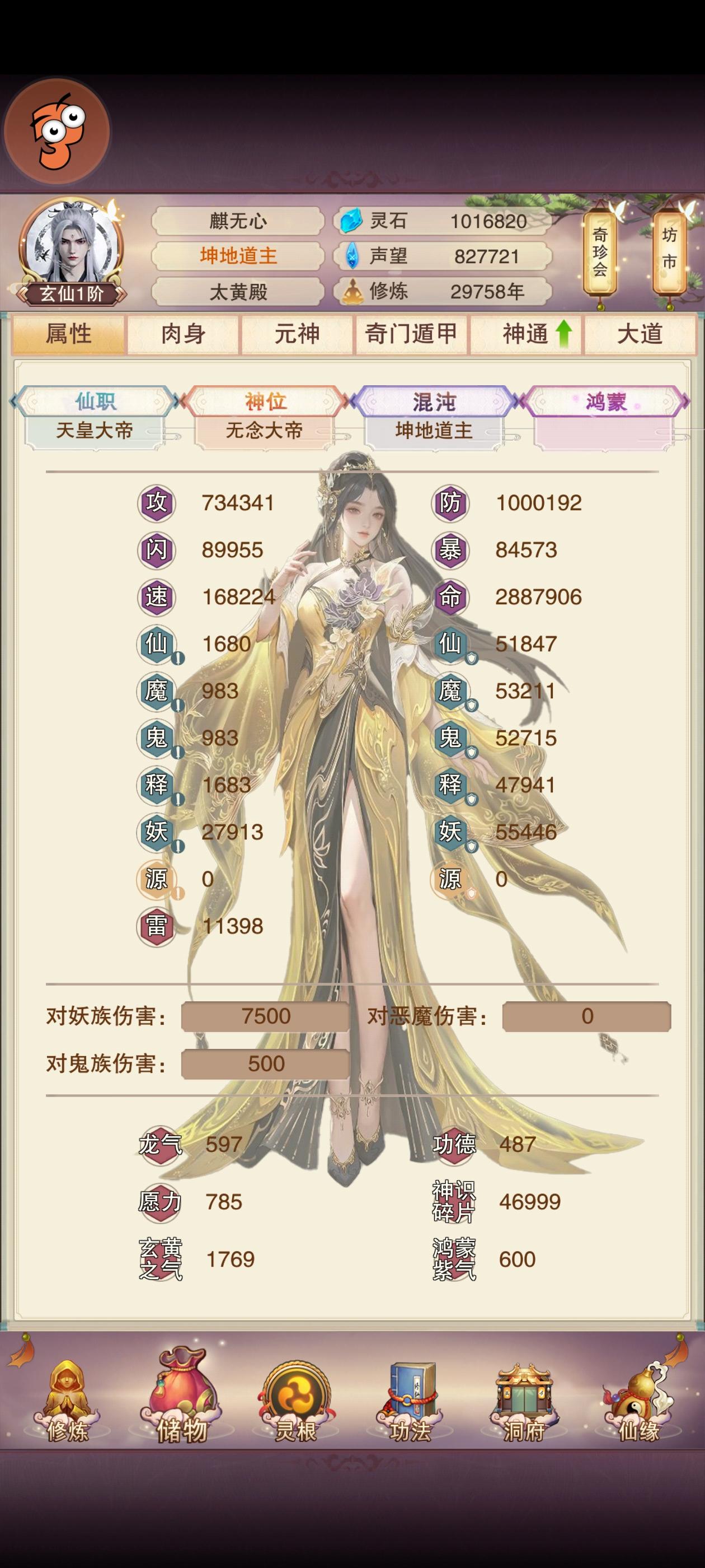 年份:4484年攻击:180704防御:405150血量:444533修为:平均50W一跳神界目前给1.2星攻防、秘术以及真伤真防学完。技能点:29个(由于刷门派不顺利,导致忘了有5个信物门派心法未学)炼体池预计明后天即可开启刚开启听课,目前听课两次,尚未遇到圣人洞府:肉87-聚灵139-洗髓71(还余约60万草铁未使用)
