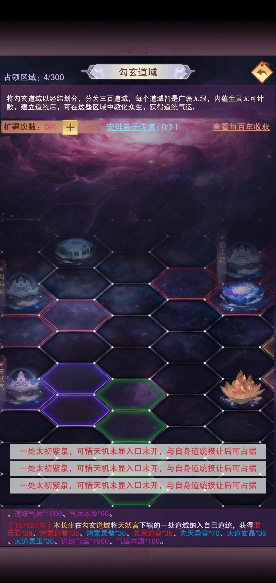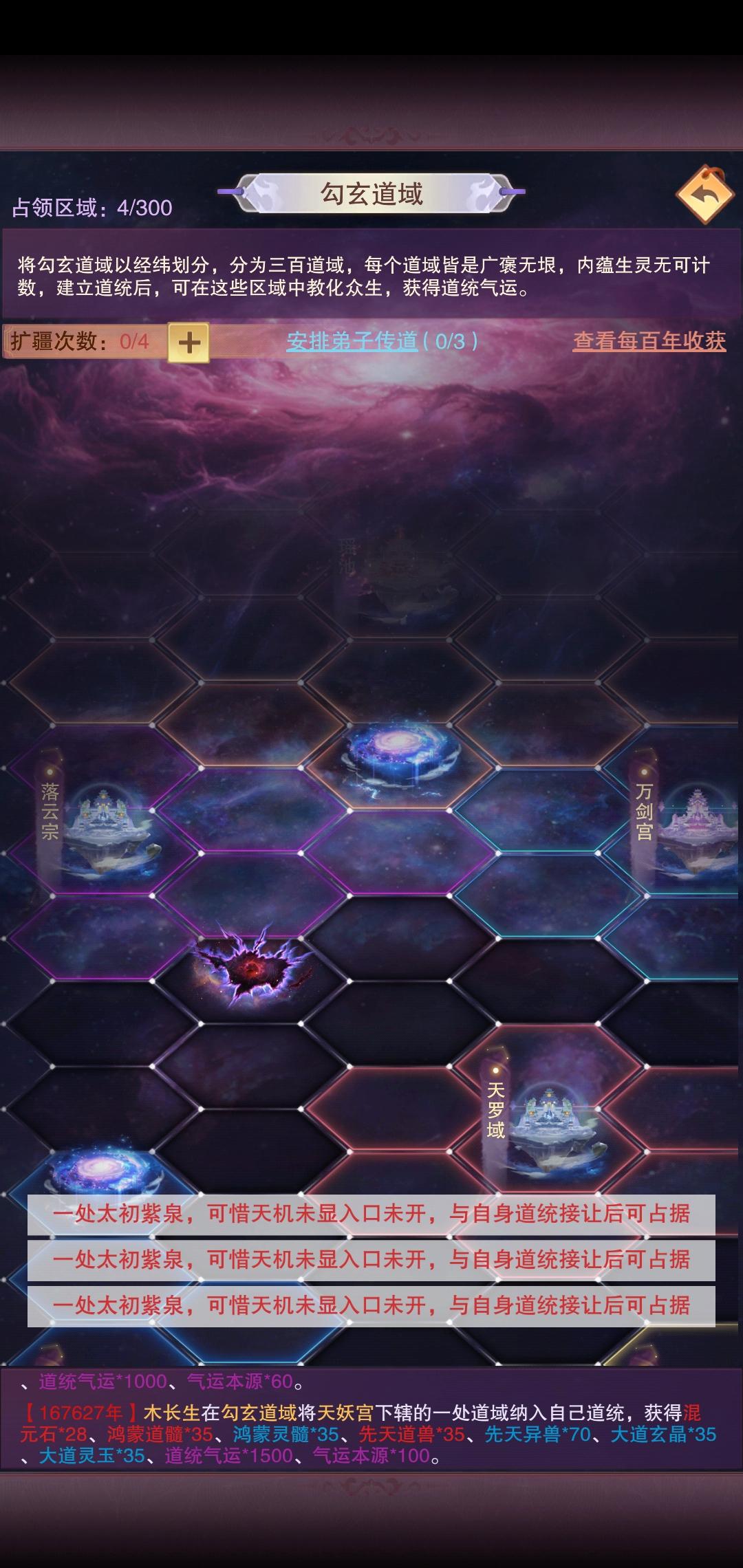 太初紫泉在图一右上角和图二左侧,像星云团一样的就是。一个勾玄道界共三个,玩法猜测和玄黄海眼一样。氪了五北养服钱,抽的弟子都是歪瓜裂枣。疆域可以先拿有主的开刀,奖励比无主疆域多。主要加属性的气运之莲不比道种差,图五中能看到已经有一万级等我们升了