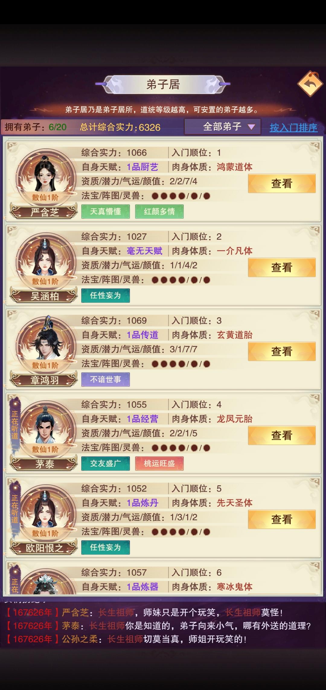 本人是九游服提前更新的,玩了几天有一点点猜测就是弟子每天只有三个人会进行有劳作剩下的人第二天刷新才会进行劳作如果猜测是正确的话,那么新进入道统的玩家,直接去任务堂,把两个游历任务一个机缘任务都给挂上去,剩下两个随机挂因为游历还有机缘任务都是要经历几天的,当你的弟子全部都在游历之后那么,可以在每天卡收益之前,召回三个弟子回来准备第二天听法 ,并且同时根据三个弟子的天赋进行对应的任务优先级。