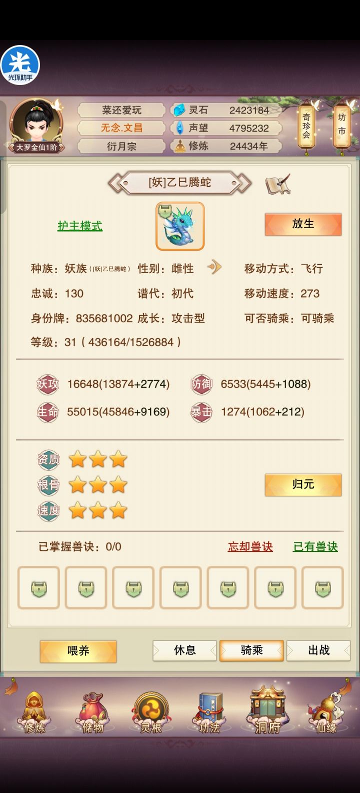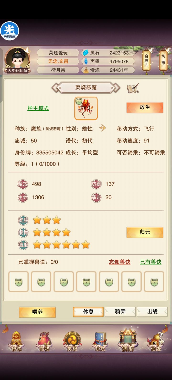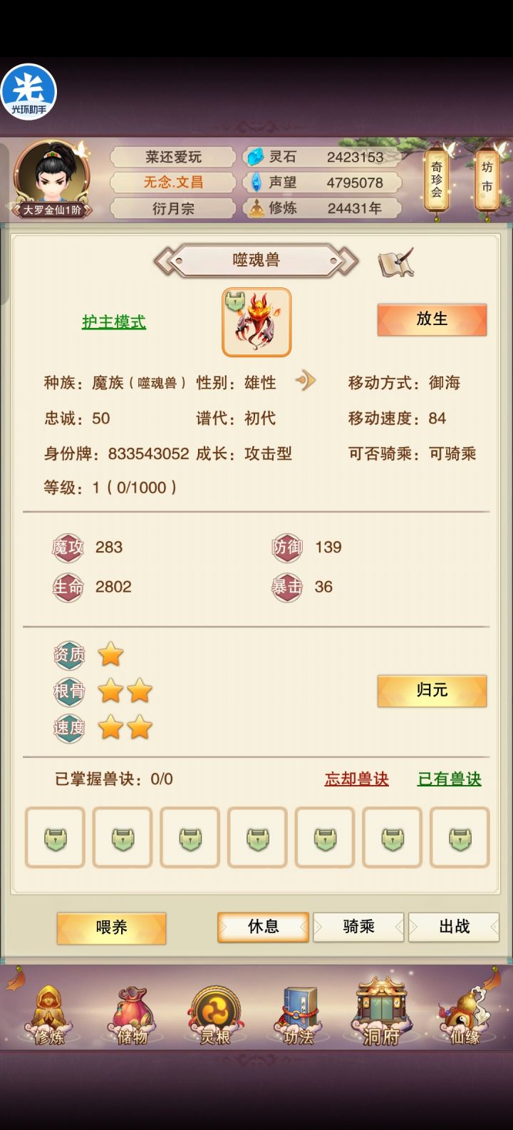 大佬们,我又不会玩了纯笨蛋说是,能不能帮我看看,我孵了几个金魔蛋,只有这两只有点用,想请教大佬些问题:1.现在只剩30兽环了,还接着孵吗,还是说买一个转雌性的道具呢?1500功德,可能对于家庭本不富裕的大罗金仙来说雪上加霜(大概要等几天25000年赈灾粮发下来才有可能够)。2.而且我要繁育的话,身上只够升一个妖兽25级,我得把跟随我许久的论道