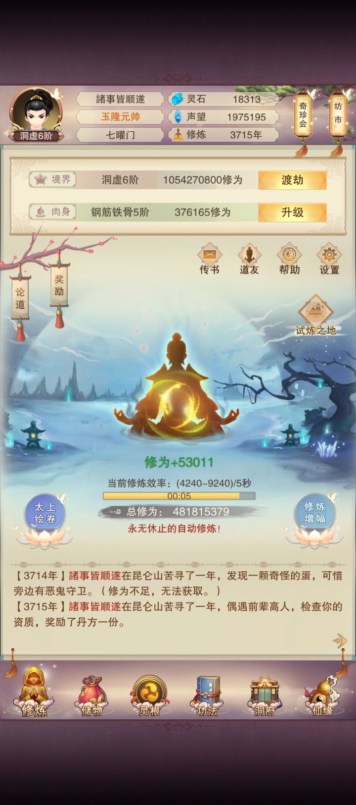 4900年,就当5000年记录贴了大乘4,银骨10,天一界主78进度,已经能打天二,可惜区一进度有点慢,预计打完天一还要被卡五天今天偷过了天十六(但是好像没啥用)九器材料蓝石头已经齐了,还差300红石头和1000+金岭洞府74肉56木(遥遥领先)预计84肉冲洗髓101,预计15天