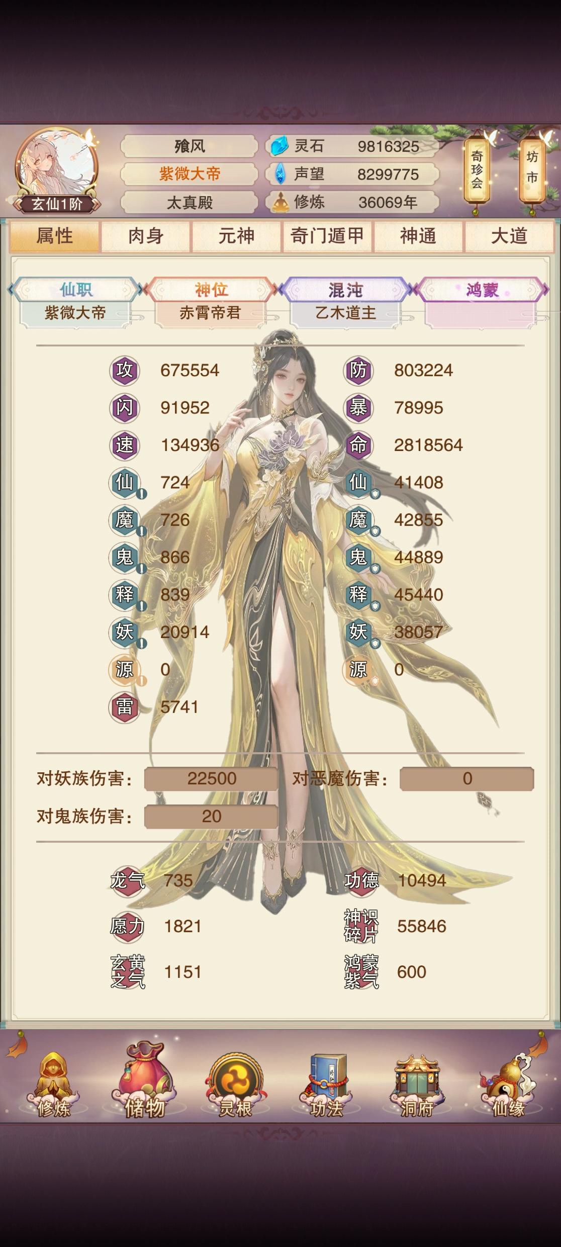 时隔2月(大概)防御属性破千万;上台感言:有一说一其实快坐化了,游戏看的少了关注的也少了唯一的乐趣就是在群里和道友们插科打诨吃吃瓜,如果没有昨天这个更新爆料那大概率,千万属性以后就坐化了。修为方面:彻底放弃修为(因为没用了),五转渡劫丹我都不买了,紫气留着(大用,根本不够用);属性方面:由于阿鬼的产能太低,使得我对游戏没有盼头(例如:夕阳游戏谁敢充钱)。所以氪金很早就已经停了。接下来目标是吃
