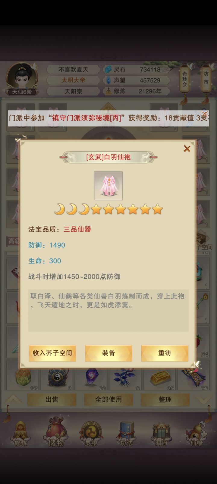 2400 - 2496 年羽凡天npc,7层6.3→6.5,8层到7.7攻了,跳1+2后继续跳1+2,这次试炼运气不错56肉38木升洗髓21,预计明天ok满收益5轮凡7,游龙袍八卦袍和药材2429年合体65品炼丹炉ok,开加炼5浑天和5体魄悟出了5品镇妖,有用,250功德get忘忧酒换了5*2=10功德,0功德背包4杯茶刚看木储量满了,直接升57肉了,明天可能洗髓21不了了,错+1