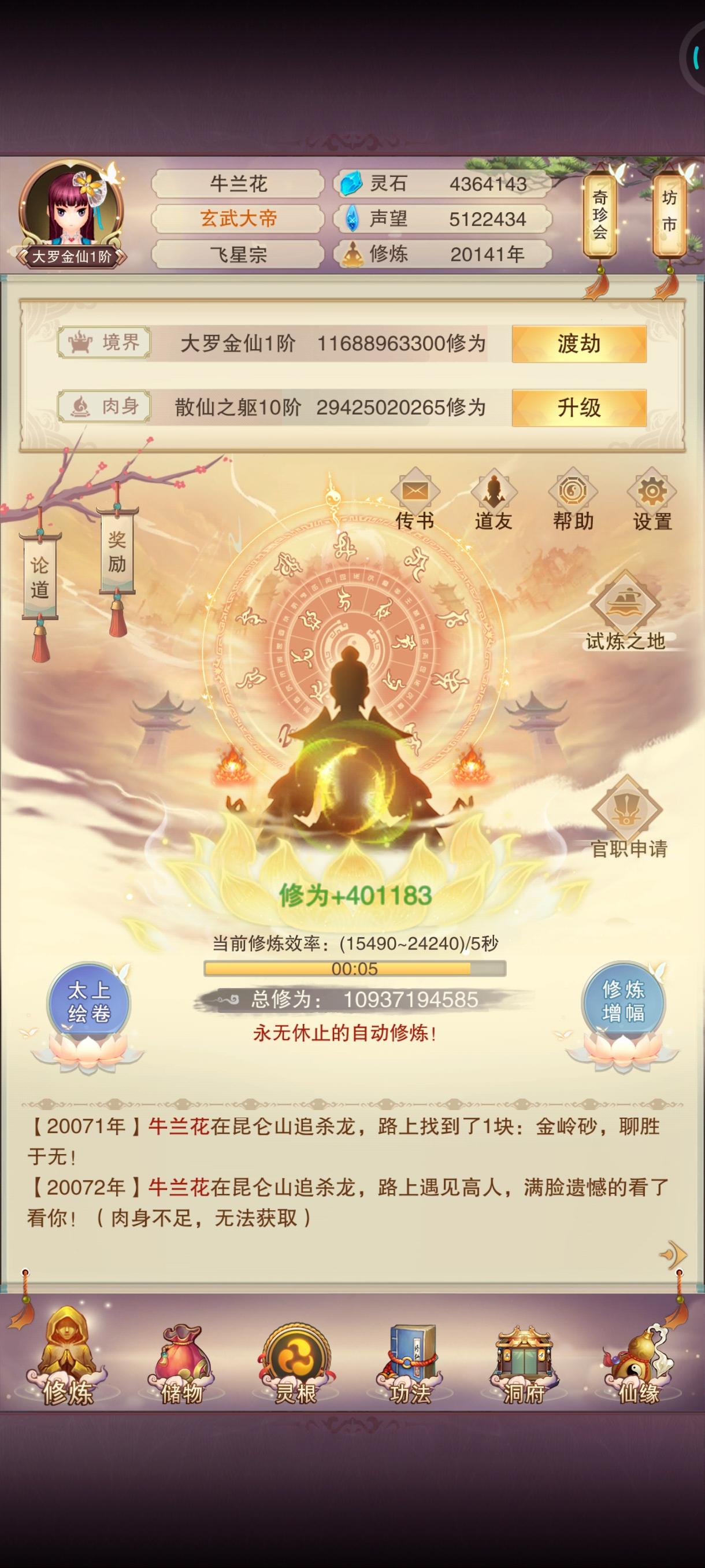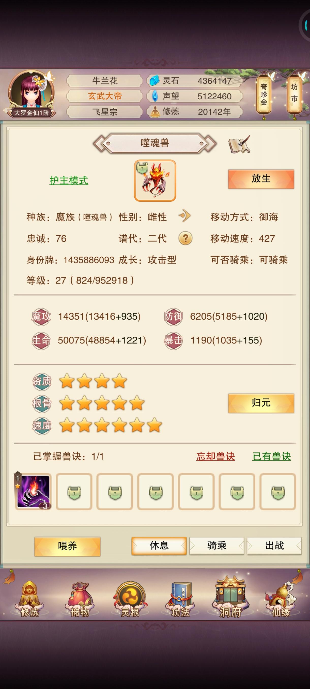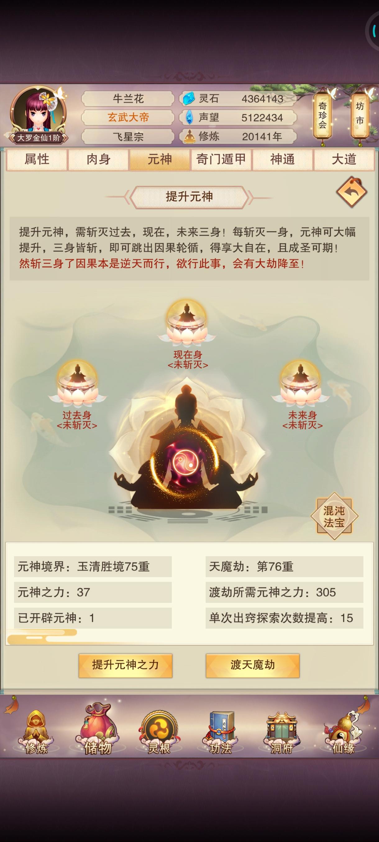 这个阶段门派刷的差不多了,开始隐世挂阵法了;开始冲元神100层了;相比1.5万年,5000年防御多了8.5万,攻击多了6.5万。现在平均下来一天涨1000防,修为40万/跳。幸运的是噬魂兽没有费劲,将就着用。