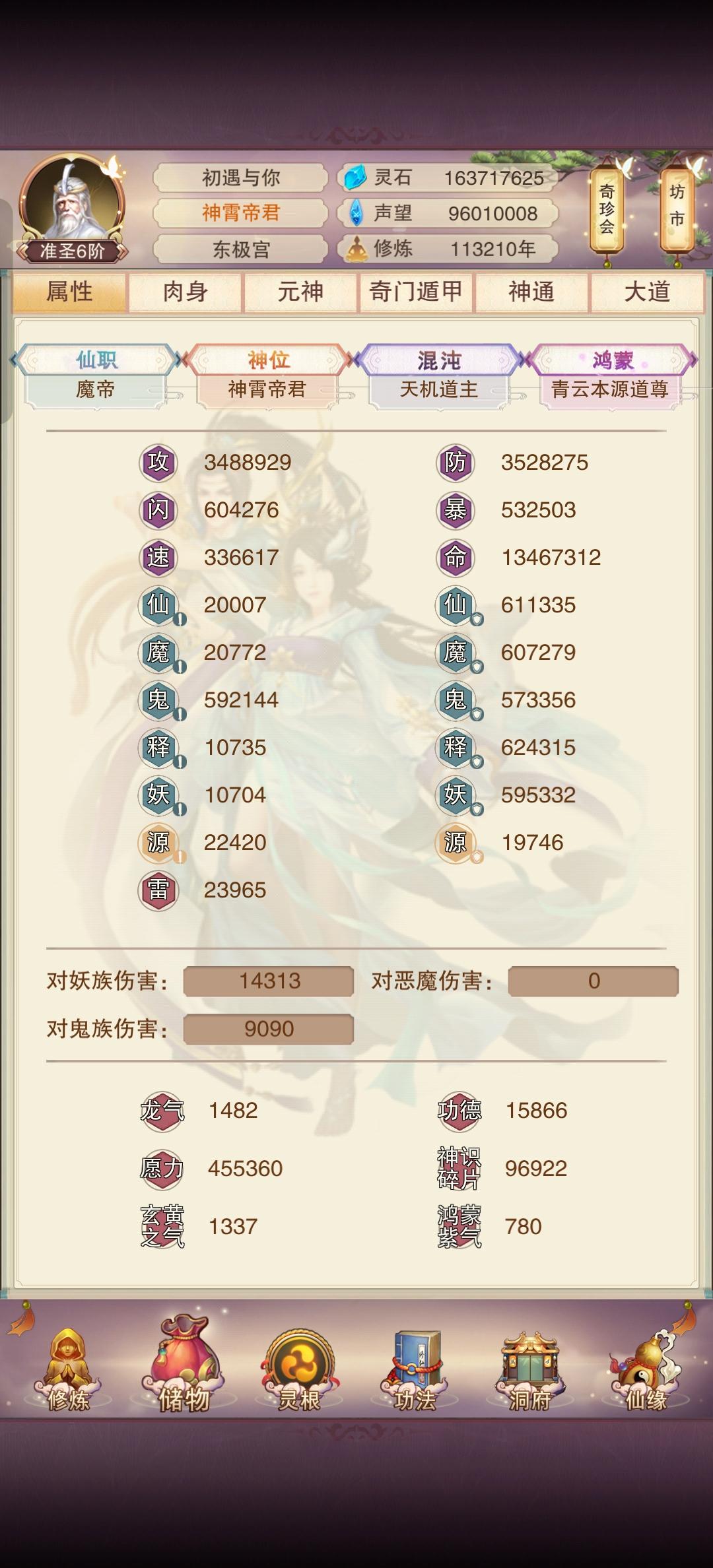 时隔2月(大概)防御属性破千万;上台感言:有一说一其实快坐化了,游戏看的少了关注的也少了唯一的乐趣就是在群里和道友们插科打诨吃吃瓜,如果没有昨天这个更新爆料那大概率,千万属性以后就坐化了。修为方面:彻底放弃修为(因为没用了),五转渡劫丹我都不买了,紫气留着(大用,根本不够用);属性方面:由于阿鬼的产能太低,使得我对游戏没有盼头(例如:夕阳游戏谁敢充钱)。所以氪金很早就已经停了。接下来目标是吃