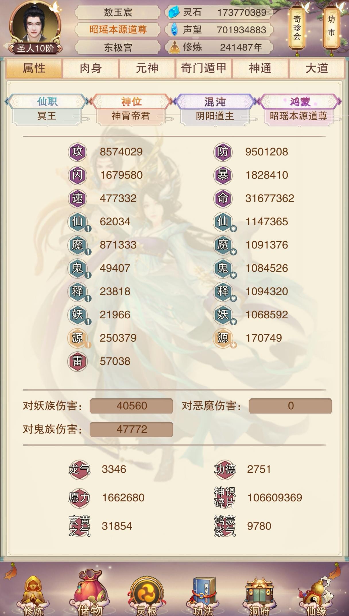 时隔2月(大概)防御属性破千万;上台感言:有一说一其实快坐化了,游戏看的少了关注的也少了唯一的乐趣就是在群里和道友们插科打诨吃吃瓜,如果没有昨天这个更新爆料那大概率,千万属性以后就坐化了。修为方面:彻底放弃修为(因为没用了),五转渡劫丹我都不买了,紫气留着(大用,根本不够用);属性方面:由于阿鬼的产能太低,使得我对游戏没有盼头(例如:夕阳游戏谁敢充钱)。所以氪金很早就已经停了。接下来目标是吃