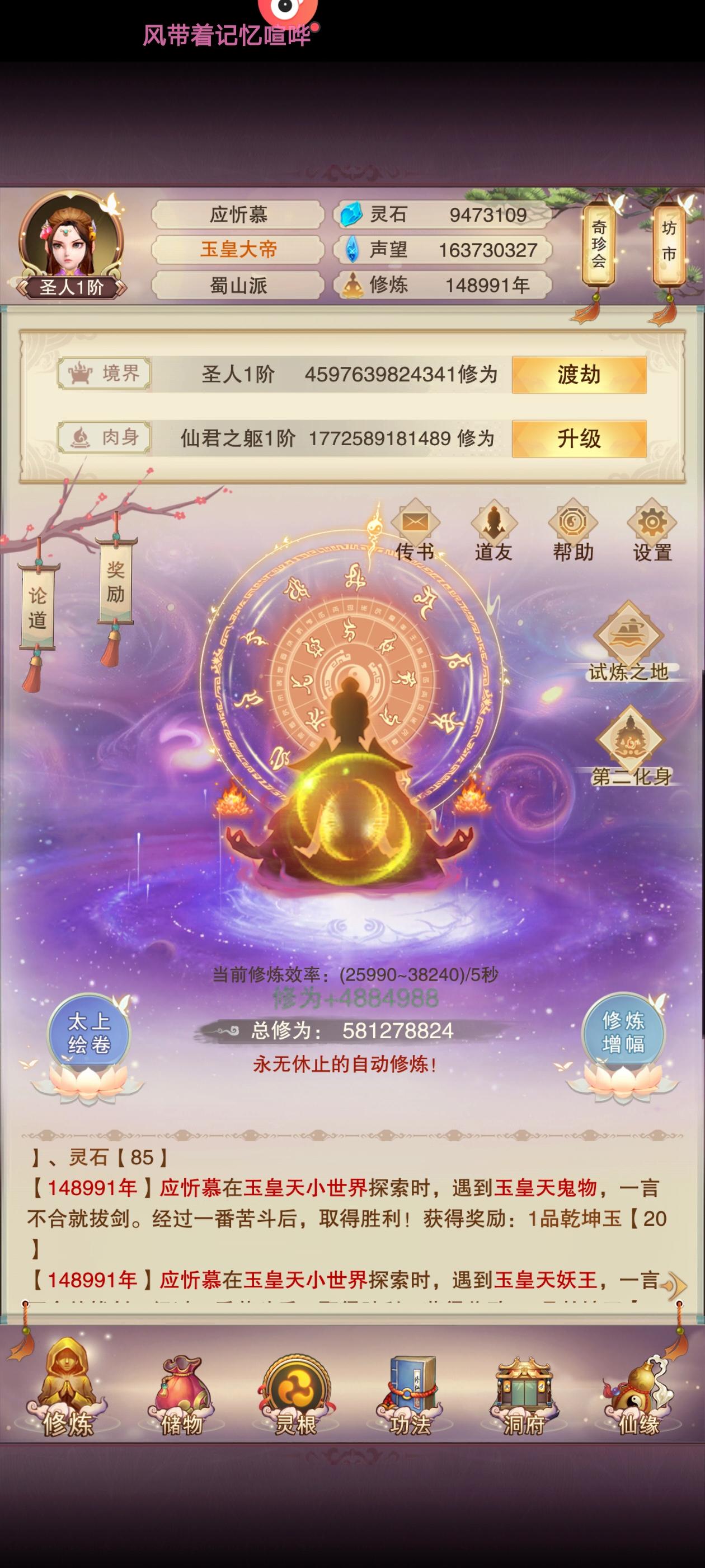 这个阶段门派刷的差不多了,开始隐世挂阵法了;开始冲元神100层了;相比1.5万年,5000年防御多了8.5万,攻击多了6.5万。现在平均下来一天涨1000防,修为40万/跳。幸运的是噬魂兽没有费劲,将就着用。
