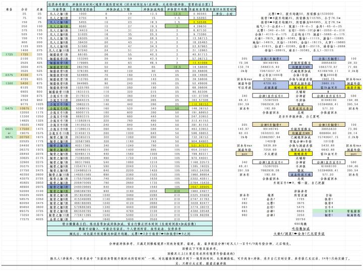 纯粹待更新不废话,直接上图看不懂的可能等文件看公式有xlsx文件,先继续丰富吧,可能会分享在qq群最理想情况,境界刚好追平,马上升出窍1 or 分神1 or 合体1 or 洞虚1出窍1存疑,因为会秒开练功房分神1存疑,因为早养魂多出窍合体1存疑,因为多刷书过凡十洞虚1存疑,因为早多一天探索分神1还有,可能上顶楼氪绝秘纯粹无极无限࿐࿆࿉࿊࿋࿌࿃☬꙳ ꙰ ꙱ ꙲༒