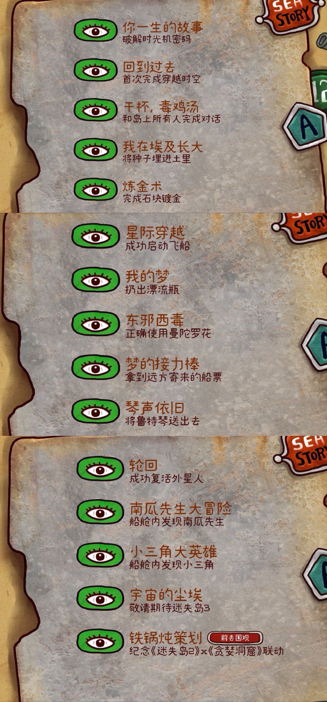 「通关打卡」 安好沙漏,开始。屋内一张素描记一下,旁边,桌上捡到火柴和蓝莓,对话老奶奶得知老爷爷会寄来船票,开启时间密码在本子上。修好壁炉旁的电线上楼,翻看老爷爷记录本拿到信箱钥匙,打开红信箱拿到船票。往左走到码头,给检票员船票,对话灯塔管理员得知灯塔指示灯没通电,灯塔密码是北南西东东北。出来继续往左路过挂着一张图纸的栅栏并捡到空瓶子,到工厂连线开门,工厂里梯子上捡到灯泡机器上捡到空间石块,屏幕上在播放奇怪符号,进去对话解刨员得知旁边坏掉的机器多硬的东西都能砸开,连线打开危险左大门见到外星人,墙上画着火箭的密码,根据栅栏上的图纸09打开右大门见到五个符号木桩,比照爷爷实验室黑板图案左右、左右、中左、中右打开铁盒子拿到鲁特琴。出来继续往左路过能看到火箭的小路前往灯塔,NSWEEN打开灯塔大门,一楼捡到铲子和拼图块,二楼捡到鱼饵和锯刀并把空瓶子给瞭望台的小孩,三楼捡到异形钥匙并修好灯塔,异形钥匙打开一楼电箱拉下闸后去到二楼拿到排风口的摇柄。去码头,船回来了,码头旁有小孩的漂流瓶,记下图案,上船,在甲板对话旅人得知他想要蓝色羽毛,按下喇叭所有按钮召唤一条飞鱼,在船舱捡到胶布,对话灯塔管理员得知一条大鱼在底层船舱和他的鱼饵可以诱惑楼上的鱼,对话小女孩得到一个时间3:42,上楼,鱼饵喂给鱼缸的鱼拿到底层船舱密码63942,开启底层船舱见到鲸鱼并捡到时间石块。去工厂给解刨员飞鱼,拿走他的刀并用胶布接好旁边机器的线修好机器。去码头调整检票员旁边的时钟到3:42打开阁楼,在桌子捡到蓝石块和铅笔,对小孩得知彩灯少一个,灯泡跟他换贝壳,八音盒安上摇杆得到乐谱DGEGDA,去船舱底部切开鲸鱼拿到矛头和鱼骨头。回奶奶家用锯刀锯下壁炉上的鹿角,实验室给机器安上两块石头,在记录本密码页用铅笔涂出笔痕得到密码,对照工厂屏幕点点和符号24、14、12、34、12、13、23、1234激活时光机回到过去。落点大手石雕,往右路过阿努比斯到火箭悬崖下对话小男孩得知在下面钟棵树能爬上去和蜥蜴想抓住海鸥。巨手往左是海鸥石雕和一条石阶,在往左在法老雕像前用铲子挖出一块异形块,在往左是眼睛石碑。把巨手前面的蜥蜴赶到海鸥石雕,驱赶石雕上海鸥让蜥蜴恐吓拿到白羽毛。上海鸥石雕旁的石阶来到神庙,用码头漂流瓶月亮上眼睛右太阳下星星左星球左开门。神庙一楼最里推砖开门对话大胡子得知曼陀罗花能让蜣螂安静后面门密码就是瓶子蜣螂花纹和他想要蓝色果实,给他蓝莓拿到一朵曼陀罗花。神庙二楼对话小女孩得知琵琶可以唤来蓝鸟,给她鲁特琴对话后弹奏八音盒乐曲DGEGDA唤来蓝鸟,对话后得知蓝鸟怕火火柴点燃身后火把吓走蓝鸟拿到蓝羽毛。给后面门安上蓝色石块开门,在陶罐里找到石饼,给雕像安上矛头拿到蓝珠子,前方拼图加上拼图块拼好拿到绿色药水。去眼睛石碑安上蓝眼珠,路后是宇航员石雕,石雕底座九宫格机关是奶奶家的素描,叉方叉圈长叉叉叉角激活宇航员得到线索。从巨手回到现实,去船舱上给虫子喂曼陀罗麻醉它拿到密码,顺便把蓝羽毛给甲板旅人拿到化石蛋。去工厂用机器压开化石蛋拿到种子,绿色药水喂给外星人,外星人跑了,身后的墙露出了符号和对应物品。回过去,打开神庙虫子门后对话大胡子得知秘密和雕像有关。找小男孩让他种下种子后回现实。火箭悬崖可以上去了,外星人房间密码打开火箭,一楼有个需要能量的机器,二楼安上箭头拿到花,拖动解锁休眠仓对话宇航员得知飞船没有燃油。到工厂09号房间根据旁边房间墙壁线索沙漏鱼骨、水流鹿角、锯齿贝壳、眼睛花、爬虫羽毛放好物品开启炼金阵给石饼镀金后回过去,神庙石头门里放上金石饼,根据石雕眼睛方向上左、左下、右右、上上调整机关拿到能量块。回现实火箭安上能量块后到三楼,用过去宇航员石雕给的方案右下、下、右上、左上、右、上调整仪表启动飞行器。 记下画板素描纸,拿蓝莓火柴,进爷爷实验室拿信箱钥匙,拿船票,拿空玻璃瓶。工厂拿灯泡空间石块,外星人房间拿远古符石,09房拿鲁特琴。灯塔拿铲子拿拼图块拿锯刀拿鱼饵扔瓶子灯通电关电闸拿摇柄。码头拿蓝石块拿铅笔拿贝壳,轮船拿飞鱼拿胶布拿石块,上楼拿神秘红球。工厂飞鱼换小刀修机器,轮船鲸鱼拿矛头鱼骨。奶奶家拿鹿角,涂密码安石块回过去,拿白羽毛拿异形快和符石。进神庙拿蓝羽毛拿蓝珠子拿石饼拿药水,蓝莓换曼陀罗虫子门后拿石符,安珠子激活九宫格。回现实轮船,蓝羽毛换化石蛋,曼陀罗喂虫子,工厂砸蛋拿种子,外星人喂药水,回过去种树。回现实进飞行器拿花和符石,叫醒宇航员。工厂09房给圆饼镀金,红球放上激活机关。回过去神庙虫子门放金饼拿能量块。回现实,捡瓶子栅栏那有个梯子能下去,按素描SUXY放好符石召唤爷爷获得一组动作,对照工厂09房机关动作记下红点位置。飞行器安能量体,调整仪表,输入爷爷动作密码614827破开玻璃罩,让飞行器飞一会会降落。