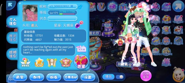 #恋舞ol 无意间在百度网盘看到了之前的游戏截图,心血来潮搜索,没想到还在!当时用平板玩了很久,最开始还可以用QQ号登陆呢,后面还给官邮发了一次信,找回了账号!接着玩了一阵,后来上大学就没怎么玩了!慢慢回忆杀!之前和朋友们开个房间在里面卡bug,聊天,刷任务,打PK,参加婚礼哈哈哈哈哈哈哈哈哈感觉那时候好中二,一晃快10年了