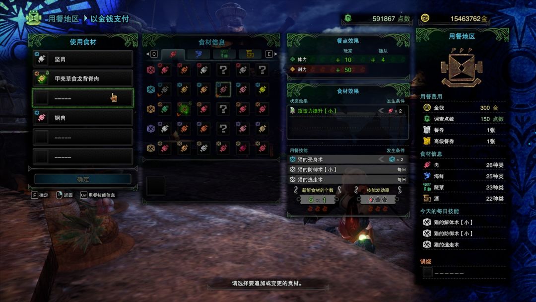 生息演算的吃饭加属性,这形式和怪物猎人、最终幻想15一样,挺有意思的。 (ps:最终幻想15截的图电脑重置删了,拿杯+30攻击+300生命值的泡面糊弄一下,后三张分别时陆行鸟、远处的巨神之地和帝国机动战舰)