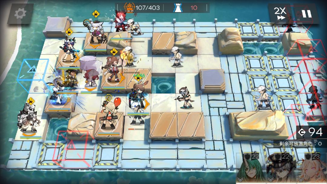 不知道别人怎么打的,我自己摸索的这个方法,然后过了四个号。稳定403。红蒂凯爹什么的试过几次终究还是舍弃了,牌子带的两个50侵蚀回复,术师组200攻,近卫组200防,还有一个近卫组水蚀状态+40%防。不想再想别的思路了。终于全打完了