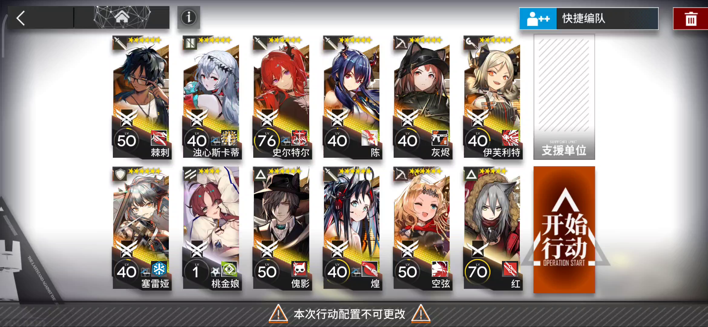 1.陈是不必要的(泥岩是最好的)可以换一个快活挡那个花癫疯 2.快活都行,没傀影用砾和夜刃也可以替代 3.开局小失误,看好时机开桃金娘技能实在懒的点换个普通先锋也行,回费会慢一点不过无所谓 4.一定等进ash范围再开技能 5.欢迎指教和评论