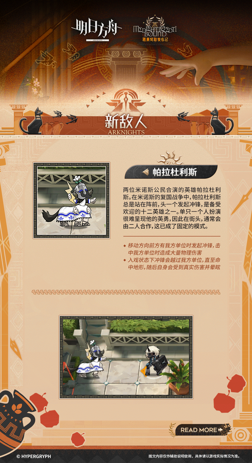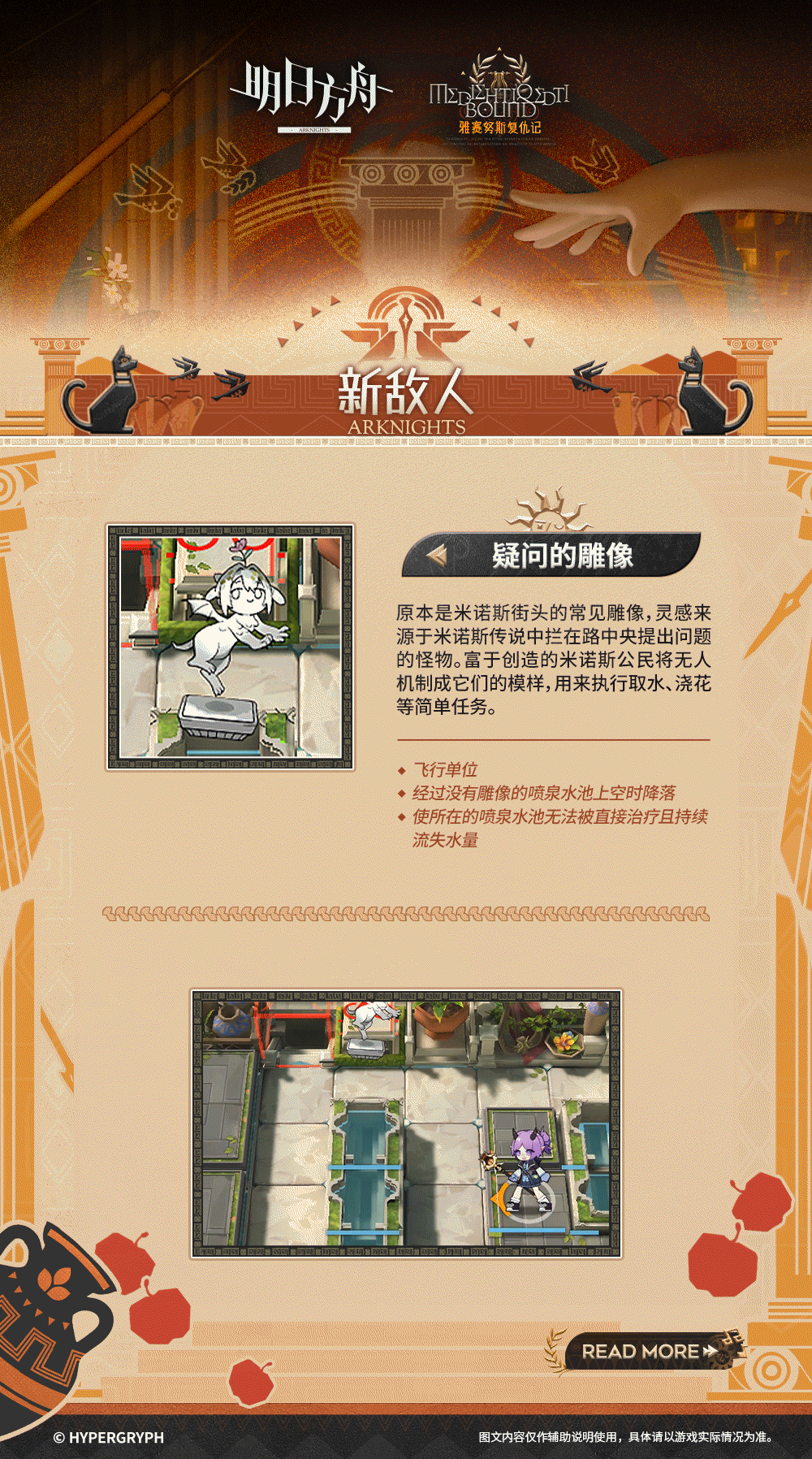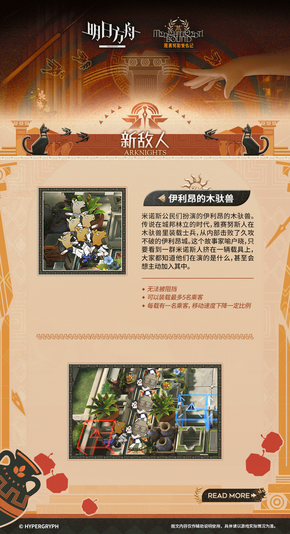 洁白的高墙,青翠的绿野,高耸的神殿,旖旎相拥的群山与河流——欢迎来到“四面环山的花园”雅赛努斯,米诺斯最初的城邦。安心地享受胜利后的丰获与美酒吧,或是纵情于无数英雄传说凝结成的戏剧,这座曾饱受异族蹂躏的移动城市如今已焕发出勃勃生机,它会热情款待每一位远道而来的客人,但是......萨尔贡人除外。