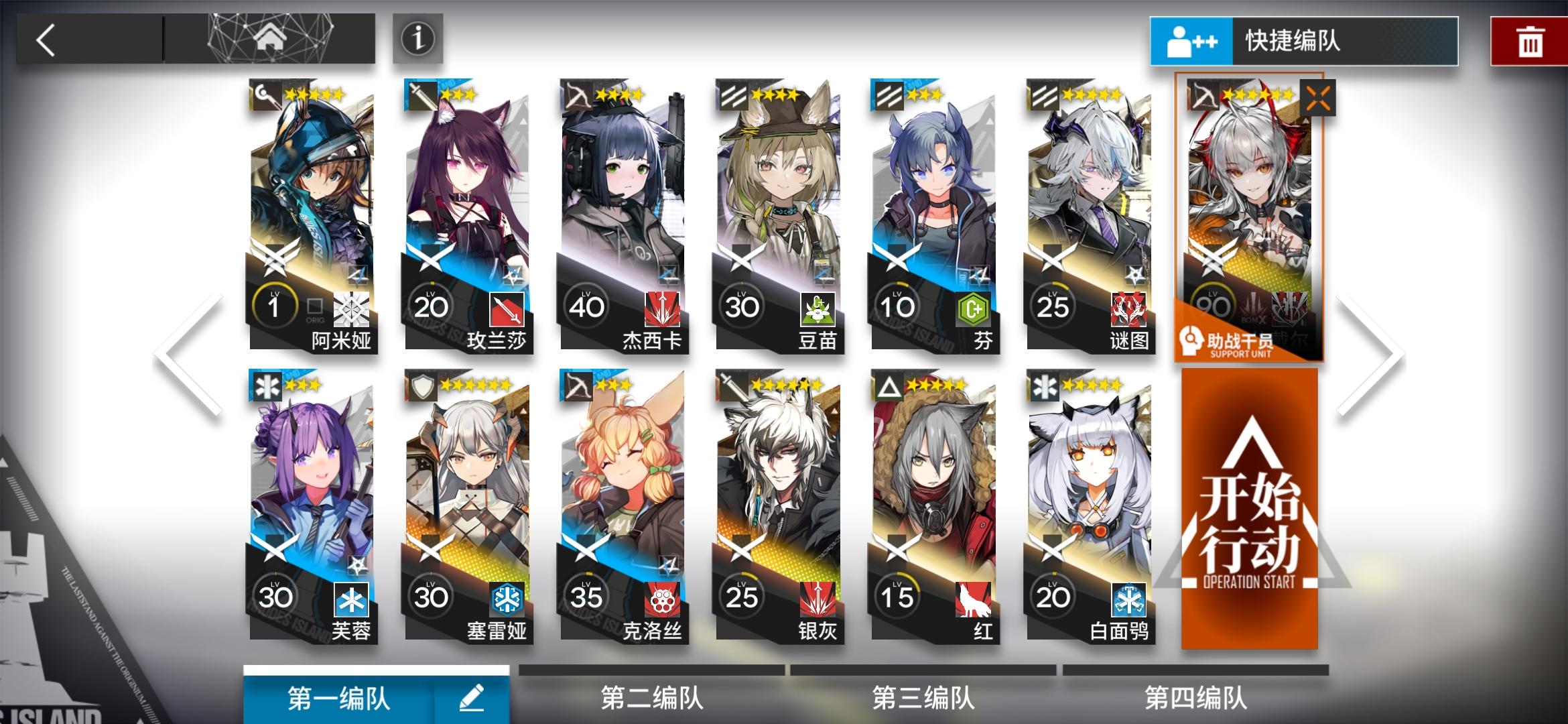 如题,我也是刚入坑没多久。练好上面这个编队里的干员就可以抄百分之九十的作业了(三星盾没练是因为我有更好的,盾位至少要3-4个,四星盾性价比最高,三星五星次之)其余的练度往我这些靠就行了,大概到精一60级左右就可以(芳汀开了技能是法术伤害,慕斯是法伤近卫+技能给怪减攻)不要去练寒芒克洛斯!我打通下来发现三星克洛斯就够用了,还是等后面需要很多狙击的时候再去练(发现寒芒克洛斯非常吃练度,不然也是刮痧)奶