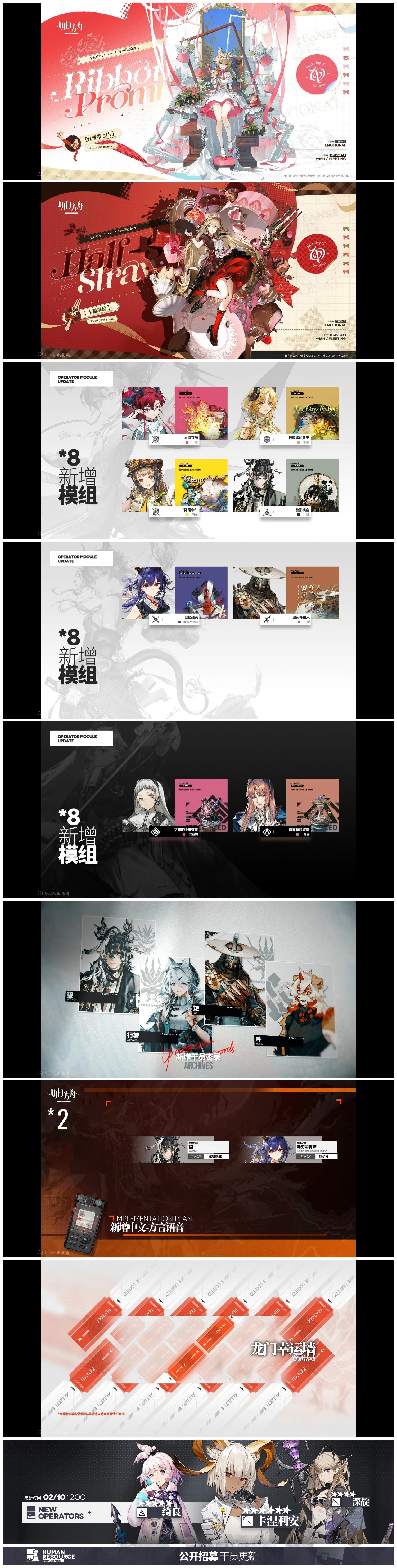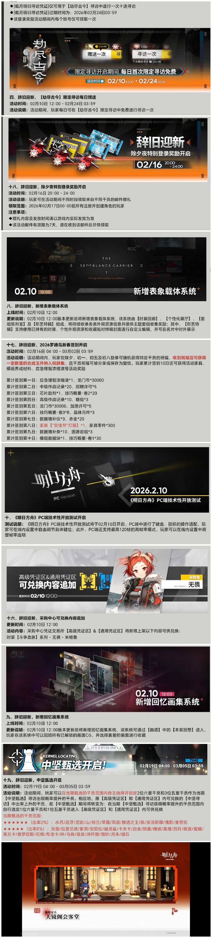活动是2月10号开卡池1.新老婆望,以旧换新第二次陈,风絮,矩2.新衣服菲莱,寻澜,余,夕,令,豆苗,微风,3.新模组,余,菲莱,响石,望,陈2.0,矩,爱丽妮和异客的特限模组4.新干员密录,望,行箸,矩,口牛5.新增中文方言,望和陈2.06.龙门倒霉墙7.新家具两套8.卡涅利安,深靛,糹奇良进公开招募9.依旧限定送10连+每天一抽10.新增名片展示系统,可以展示自己的各种没用