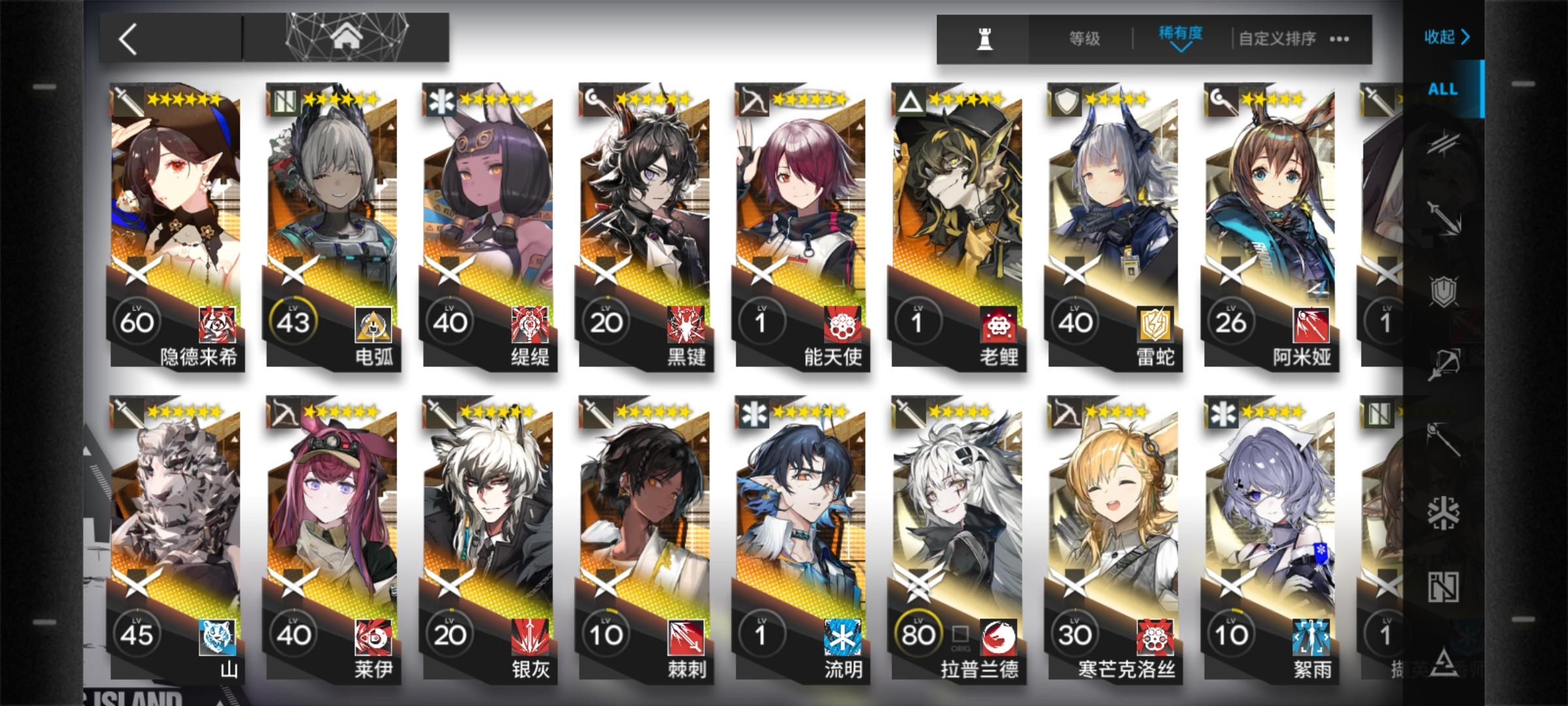 如题,我也是刚入坑没多久。练好上面这个编队里的干员就可以抄百分之九十的作业了(三星盾没练是因为我有更好的,盾位至少要3-4个,四星盾性价比最高,三星五星次之)其余的练度往我这些靠就行了,大概到精一60级左右就可以(芳汀开了技能是法术伤害,慕斯是法伤近卫+技能给怪减攻)不要去练寒芒克洛斯!我打通下来发现三星克洛斯就够用了,还是等后面需要很多狙击的时候再去练(发现寒芒克洛斯非常吃练度,不然也是刮痧)奶