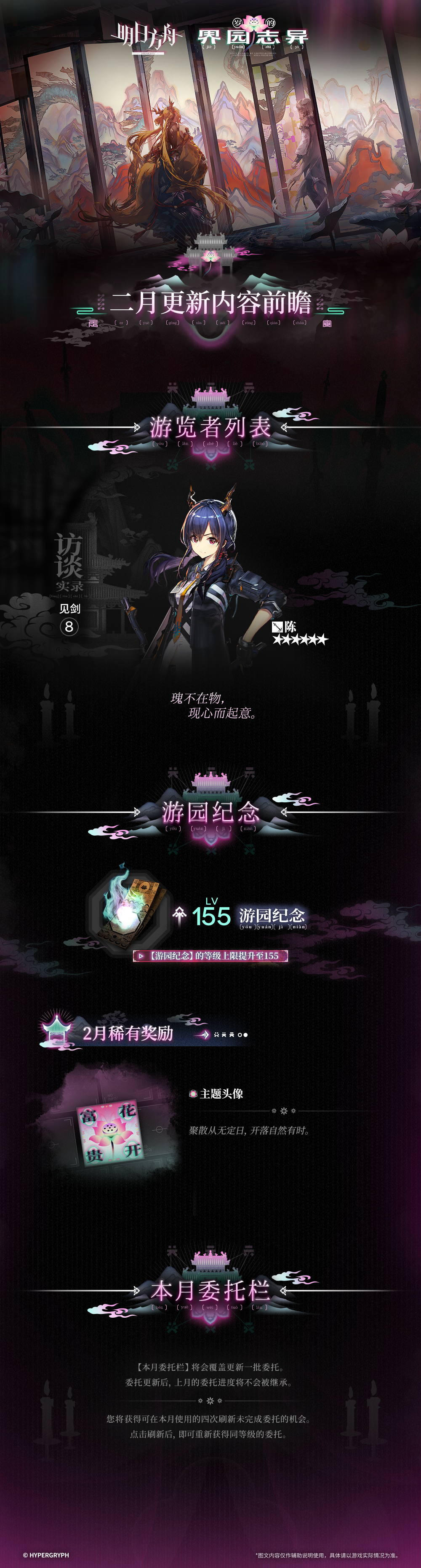 集成战略「岁的界园志异」二月更新内容前瞻◆ 【游览者列表】本月【游览者列表】:陈◆ 【游园纪念】【游园纪念】的等级上限提升至155。本月稀有奖励:主题头像◆ 【本月委托栏】【本月委托栏】将会覆盖更新一批委托。委托更新后,上月的委托进度将不会被继承。您将获得可在本月使用的四次刷新未完成委托的机会。点击刷新后,即可重新获得同等级的委托。_________________更多「