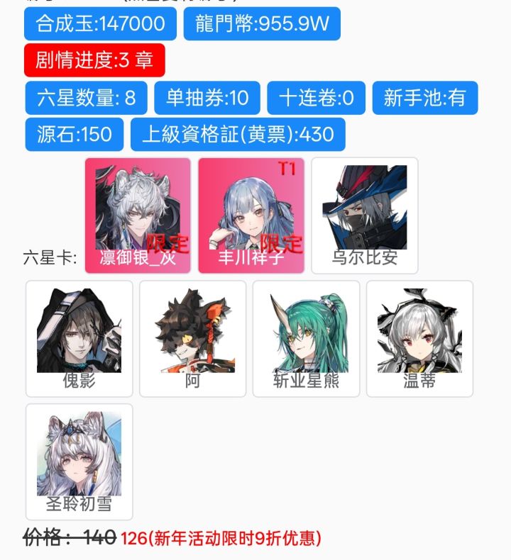 我的号是从去年异格银灰和初雪那个池子开始的,因为没有保底,想着随便来点意思一下就行了,结果出了银灰,但我看初雪有挂机技能,想要一个,最后全歪,一个初雪都没捞到。还有春节限定池子也一样,那会算的其实差不多够保底,结果有一个月的黄票忘记兑换了,最后大概有二百七十多抽结束,一个望也没有,异格陈都三命了。这次的这个异格凛冬池子,我看二技能也能挂机,所以就又下手了,结果没攒够保底,又全歪了,现在只抽了一