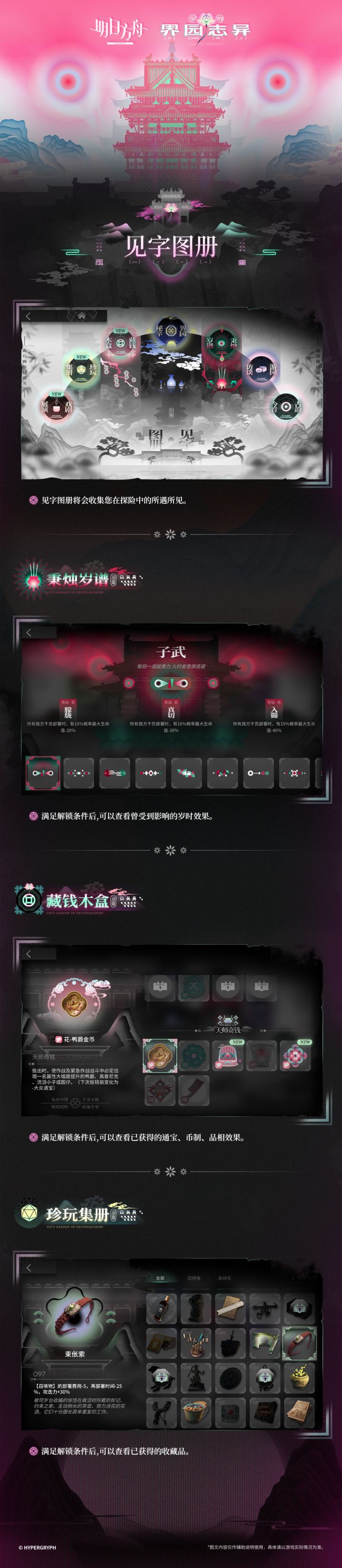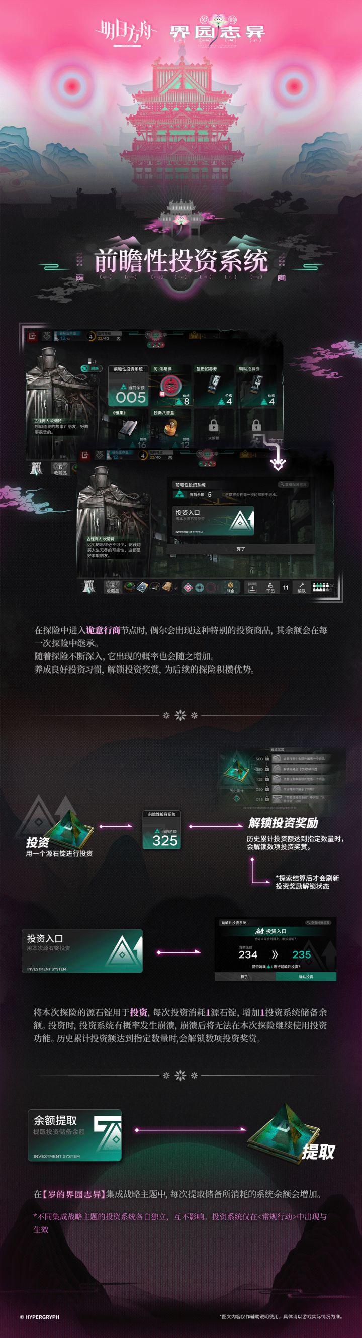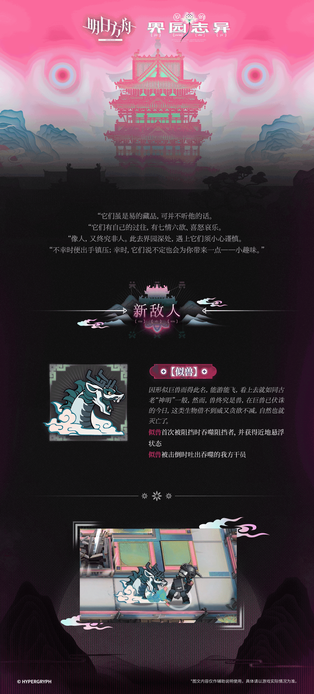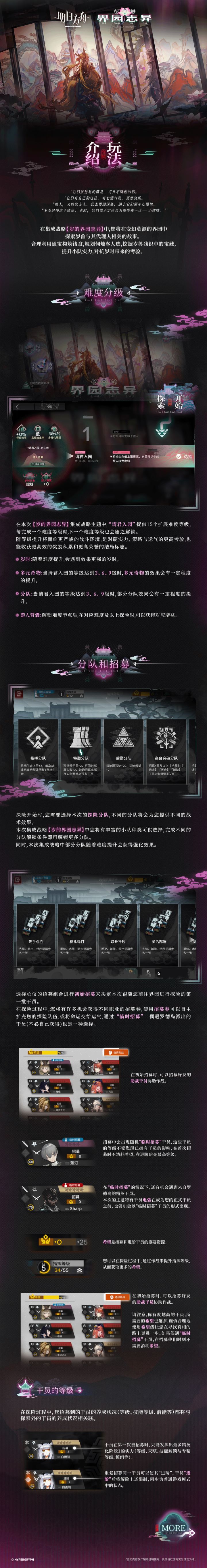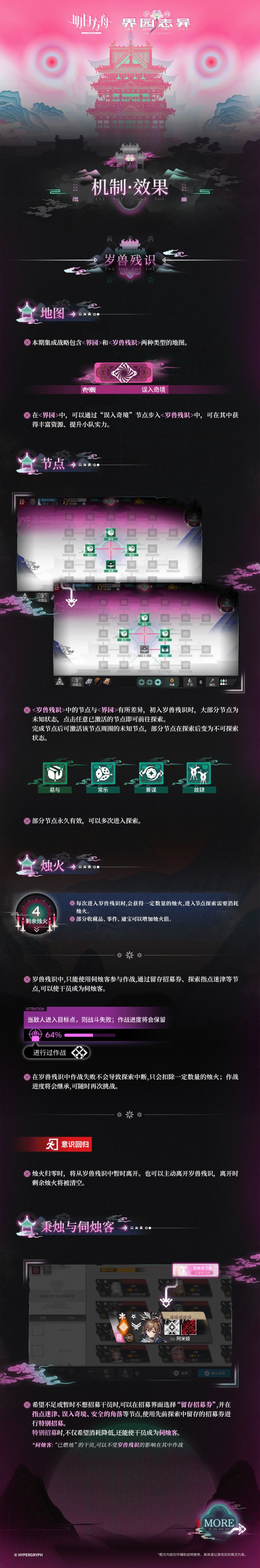 集成战略「岁的界园志异」机制·效果 前瞻在集成战略「岁的界园志异」中,您将在变幻莫测的界园中探索岁兽与其代理人相关的故事。合理利用通宝构筑钱盒,规划伺烛客人选,挖掘岁兽残识中的宝藏,提升小队实力,对抗岁时带来的考验。_________________主题官网链接:https://ak.hypergryph.com/is/gardenofgrotesqueries?source_from=t