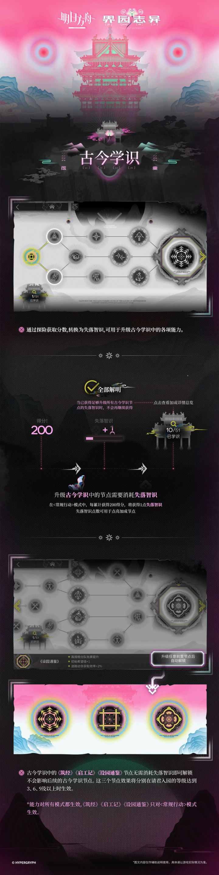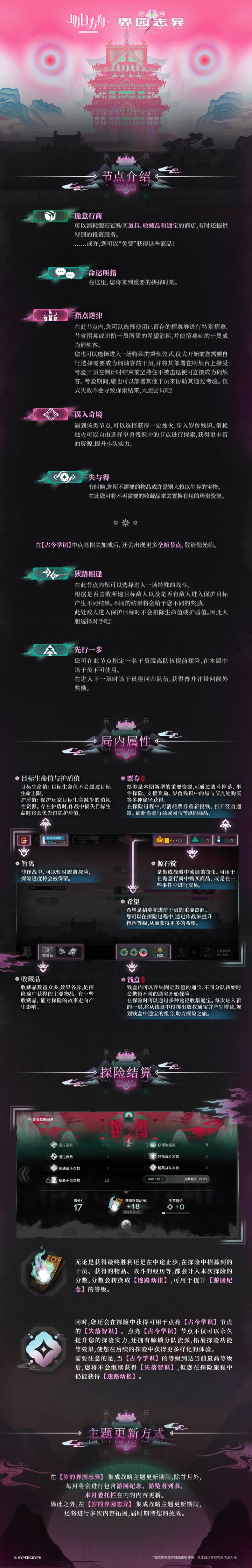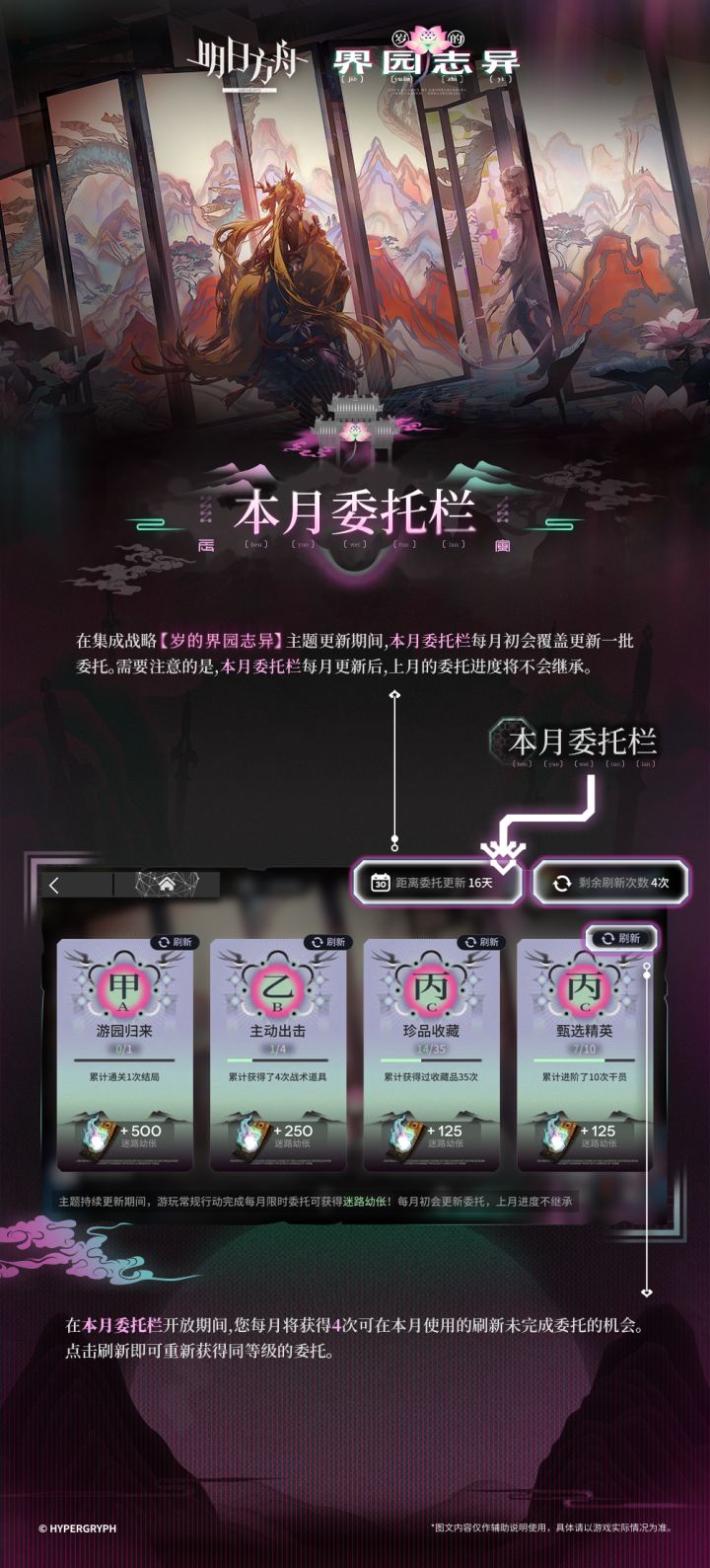 集成战略「岁的界园志异」 本月委托栏·前瞻性投资系统·见字图册·古今学识 ◆ 在集成战略「岁的界园志异」主题更新期间,本月委托栏每月初会覆盖更新一批委托。◆ 当您行至【诡意行商】节点时,【前瞻性投资系统】将有概率出现在坎诺特的商店中。◆ 【见字图册】将会收集您在探险中的所遇所见。◆ 通过探险获取分数,转换为失落智识,可用于升级【古今学识】中的各项能力。_________________