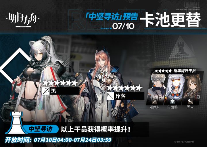 【中坚寻访】起止时间:7月10日04:00 ~ 7月24日03:59寻访说明:该寻访中以下干员获得概率提升;★★★★★★:黑 / 异客(占6★出率的50%)★★★★★:送葬人 / 白面鸮 / 天火(占5★出率的50%)*本次寻访期间,以下干员可于凭证交易所内使用高级凭证或通用凭证兑换:黑、送葬人更多后续活动内容及最新消息请关注《明日方舟》游戏内公告、官网及官方自媒体账号,感谢大家的支持