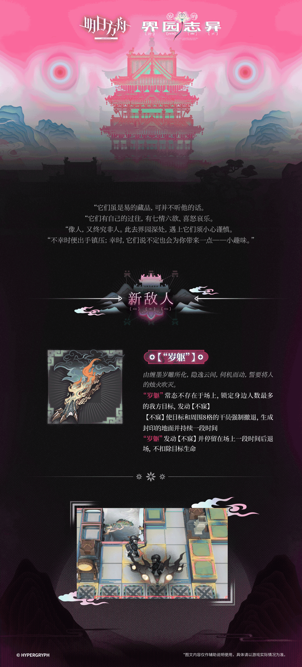 集成战略 「岁的界园志异」 玩法介绍在集成战略【岁的界园志异】中,您将在变幻莫测的界园中探索岁兽与其代理人相关的故事。合理利用通宝构筑钱盒,规划伺烛客人选,挖掘岁兽残识中的宝藏,提升小队实力,对抗岁时带来的考验。具体奖励、全新机制、玩法模式等更多「岁的界园志异」集成战略主题内容,请持续关注《明日方舟》自媒体账号。_________________主题官网链接:https://ak.hyp