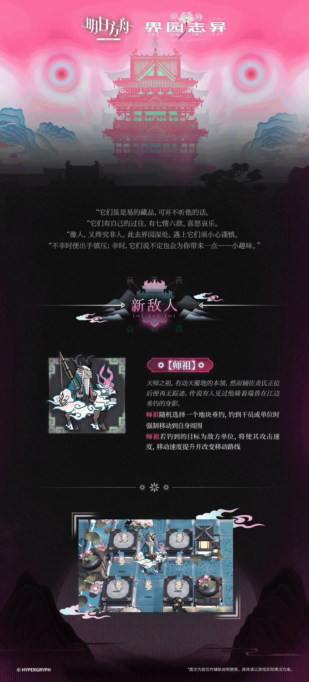 《明日方舟》集成战略「岁的界园志异」宣传PV · 玩法介绍奇岩,异草,景中藏境,旧物新缘。洞穿异象,镇压祸乱,或许能看见......失落已久的真相。_____________全新集成战略主题「岁的界园志异」,即将开启主题开启时间:2025年07月15日 16:00主题官网链接:https://ak.hypergryph.com/is/gardenofgrotesqueries?sour
