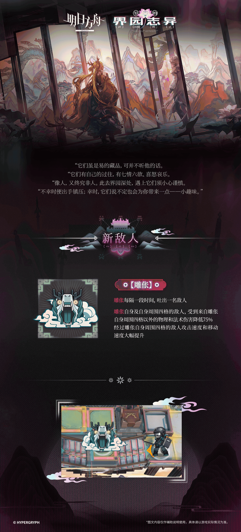 集成战略「岁的界园志异」新敌人“它们虽是易的藏品,可并不听他的话。“它们有自己的过往,有七情六欲、喜怒哀乐。“像人,又终究非人。此去界园深处,遇上它们须小心谨慎。“不幸时便出手镇压;幸时,它们说不定也会为你带来一点——小趣味。”_________________主题官网链接:https://ak.hypergryph.com/is/gardenofgrotesqueries?sourc