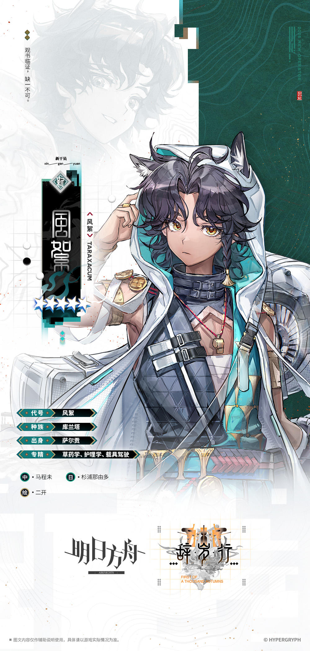 【新增干员】//风絮“您好,叫我风絮就行。老师让我来这里交流学习,顺便向他的几个兄弟姐妹报声平安。我?一介车夫,稍微也懂些医术。”____________【年的回信】哟,稀罕事。那天不好意思露面,现在倒想起给我这个姐姐写信了?你那个小学徒——“风絮”,是吧?一听就知道是你取的名儿。放心,那天见过,小个子当时还特地给他准备了一份萨尔贡的小吃来着。托他捎给你的那份吃完了没?说好了啊,没吃完可