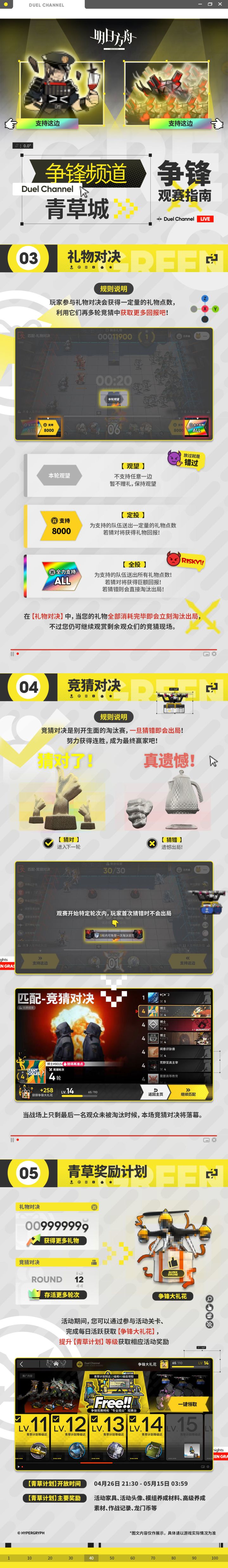 「争锋频道:青草城」限时活动开启关卡开放时间:04月26日 21:30 - 05月12日 03:59解锁条件:通关主线1-10活动说明:活动期间,玩家可通过参与活动关卡、完成每日活跃获取【争锋大礼花】,提升【青草计划】等级获取相应活动奖励 【青草计划】开放时间:04月26日 21:30 - 05月15日 03:59【青草计划】主要奖励:活动家具、活动头像、模组养成材料、高级养成素材、作