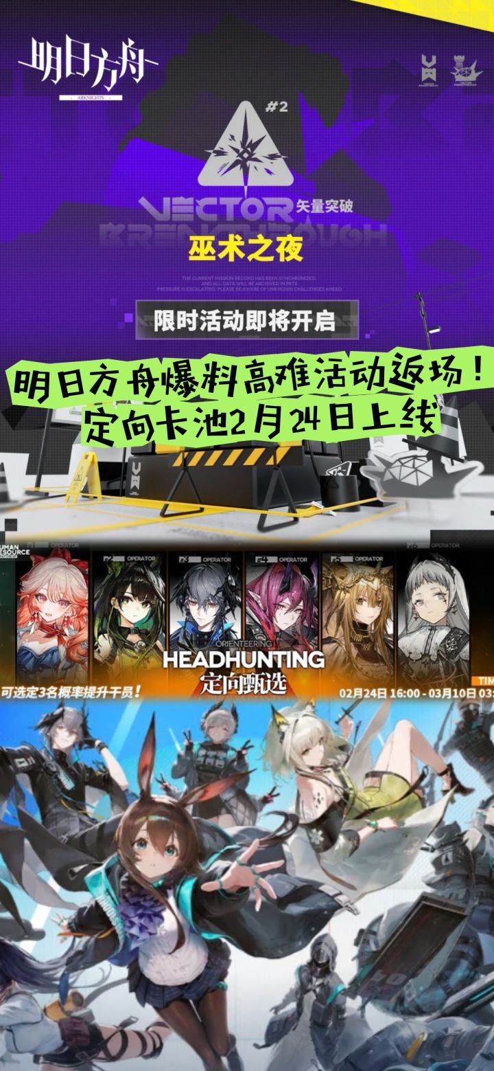 《明日方舟》高难活动矢量突破第二期「巫术之夜」爆料来袭,确定于2月24日16点正式开启,持续至3月17日4点,解锁条件为通关主线2-10,成为玩家近期热议焦点。本次活动在初代高难基础上升级玩法,主打黑夜环境与敌人隐匿机制,强化视野朝向判定,未处于角色视野内的敌人将进入隐身状态,关卡挑战难度再升级。福利与玩法同步上线,活动期间通关可获取「小心地滑」道具提升里程碑等级,兑换格雷伊「都会送报员」新时