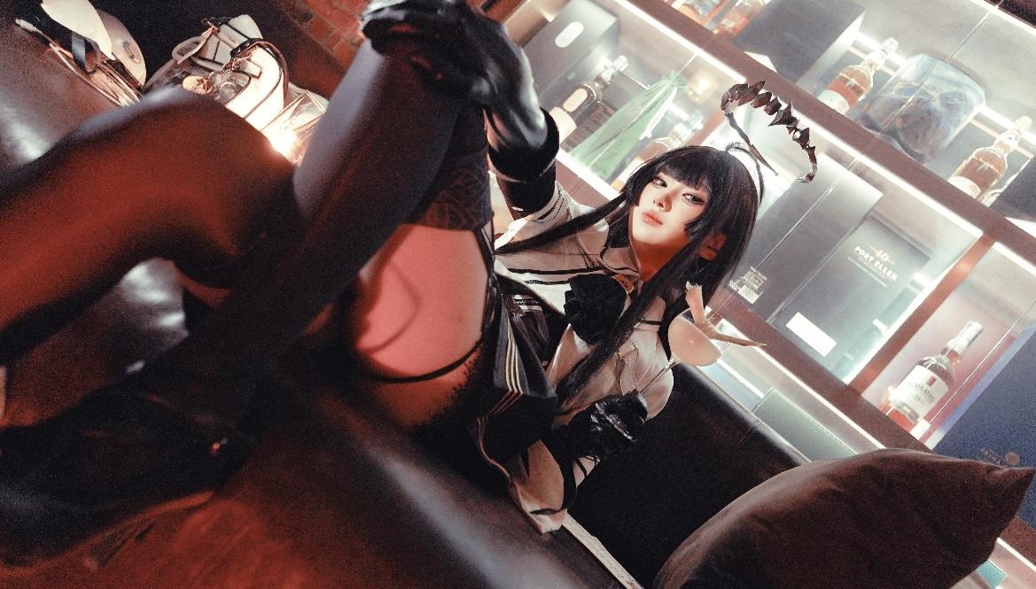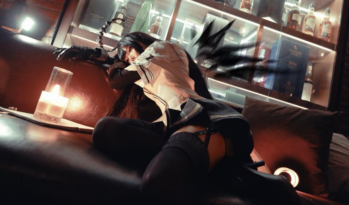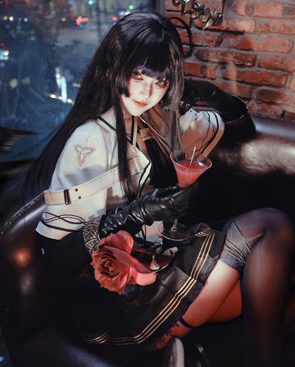 这组cos大片凭借极致的氛围感与精准的角色诠释,堪称封神之作。复古的皮质沙发、斑驳的红砖墙面,搭配窗外的夜色霓虹,冷硬的工业风与柔美的人物线条碰撞,瞬间营造出神秘又魅惑的都市夜色氛围。出镜者的造型与角色高度契合,黑长直的发丝柔顺且富有光泽,齐刘海的设计添了几分娇俏,而发间的金属装饰又带着冷冽的锋芒,与角色的特质完美贴合;服饰的搭配极具巧思,白色的上衣带着精致的纹路,黑色的短裙缀着明艳的红玫瑰,红与
