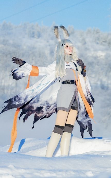 这张雪景COS作品意境绝美,将角色的清冷与孤高诠释得入木三分。银白长发与兔耳在漫天飞雪中愈发蓬松,发间的发卡简约精致,与雪地背景融为一体,自带清冷氛围感。妆容清透自然,眉眼温柔又带着一丝坚毅,眼妆的浅淡晕染与雪景相得益彰,唇色清冷,尽显角色的淡然气质。白色为主调的服饰搭配橙色点缀,水墨风的衣摆飘逸灵动,黑色手套与护膝的细节设计,既贴合角色设定,又增添了层次感。双手捧起的姿态温柔细腻,仿佛在轻触落雪