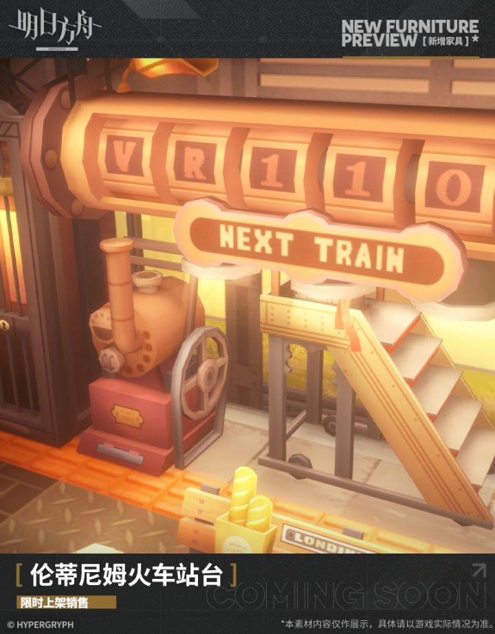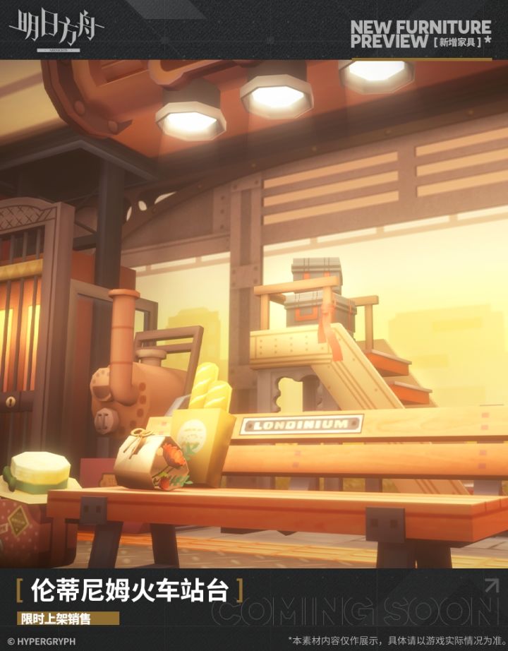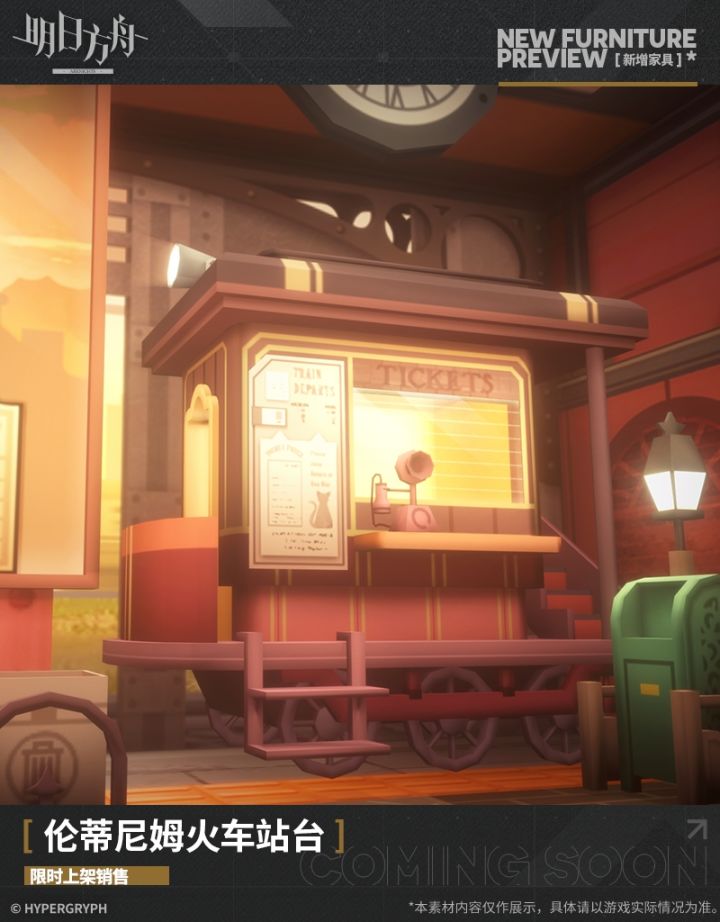 【新增家具】//伦蒂尼姆火车站台根据多位干员的描述复现的傍晚的火车站台。经常有维多利亚干员来此喝茶、闲谈,或是什么都不做,就只是安静地坐在那里。_________________新增【伦蒂尼姆火车站台】主题家具,限时上架家具商店贩售时间:10月9日16:00 - 10月23日03:59