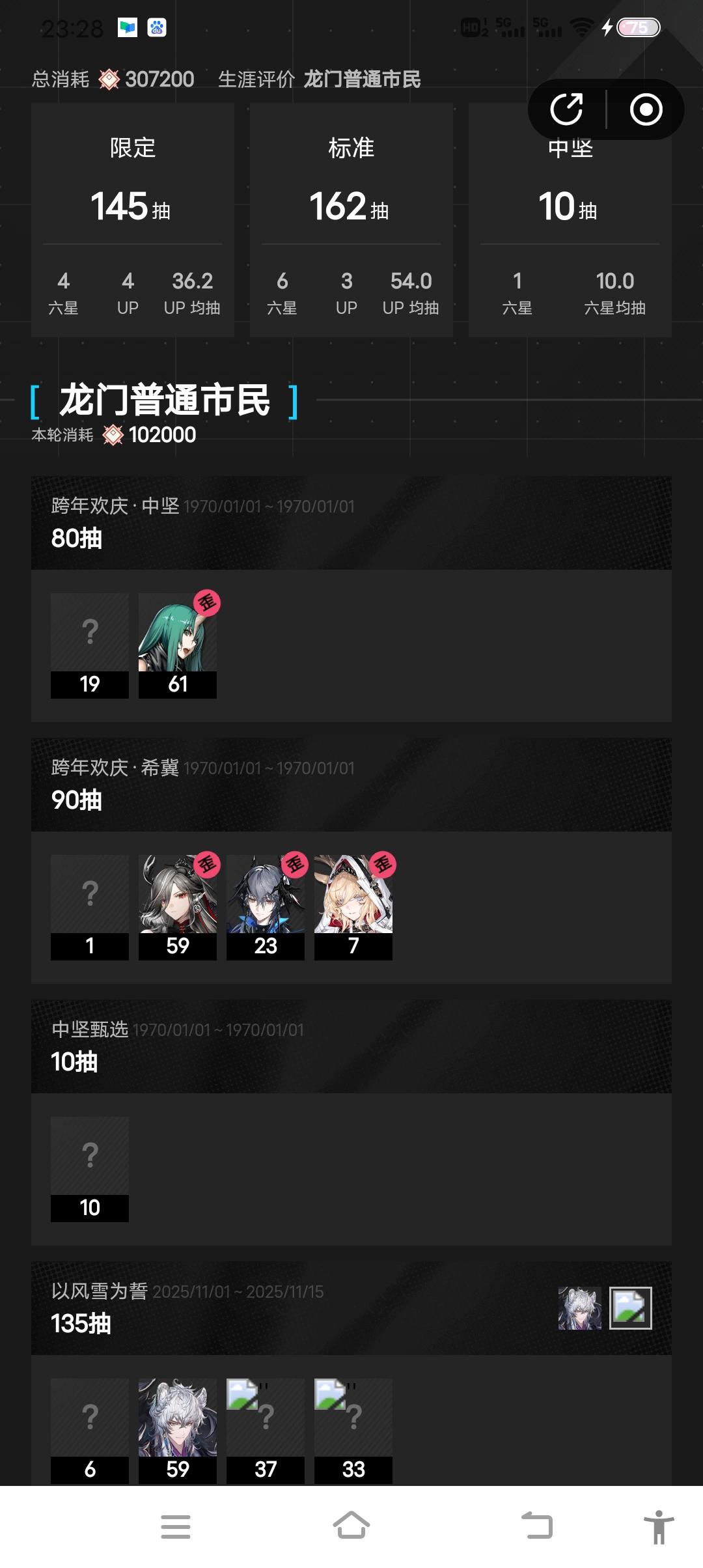 退坑之前梭哈一把,断了以后回坑的念想,一个游戏如果反复退坑回坑也没意思,顺便给纠结要不要抽必new池的看看爆率作个参考。母鸡卡入坑一发十连抽了个祥子,之后一直到异银初雪卡池那个时候才正式玩,玩了几天卸载了过了几天又下回来,之后一直玩到现在,游戏是挺好的,但我对肉鸽不感兴趣,剧情也都是跳过的,主线基本也是无脑推过去的,最有意思的反而是刚开始玩的时候,借个ew也是很容易过主线,但总会漏一两个怪,尤其是