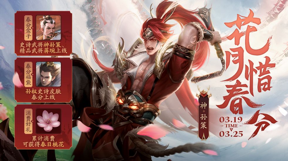 神孙策上线,春分礼盒获得 蒋琬上线,春分礼盒获得 蒋钦身份场上线,春分福袋获得 计韬武略*吕蒙上线,春分礼盒获得 潜龙在渊*孙权上线,春分福袋获得 星夜袭曹*马超上线,梦之回廊获得 着手成春*司马朗上线,梦之回廊获得 誓报此仇*辛毗上线,史诗体验卡兑换 一、春日好礼 时间:3月19日-3月25日 内容: (1)春分登录礼 活动期间,4.0.1.0版本及以上的50级以上玩家每日可在特惠中心领取春分福