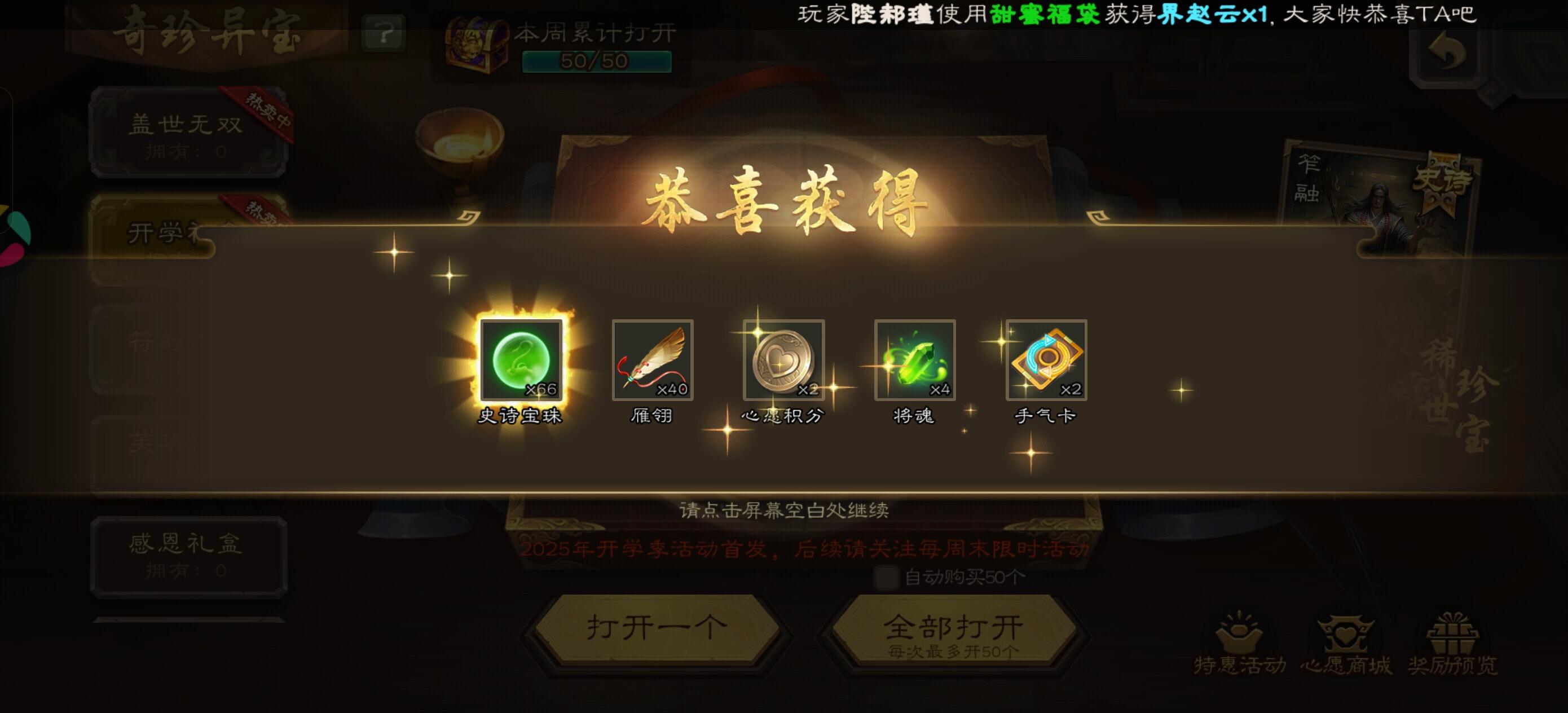 星周不疑上线,琳琅奇境获得 吴班上线,冬日福袋获得 李遗上线,天工宝库获得 忧君难寐*貂蝉上线,奇门探宝获得 兔年冬日*蔡贞姬上线,冬日福袋获得 匡汉延祚*神荀彧上线,梦之回廊获得 袭蜀神兵*邓艾上线,梦之回廊获得 怒斩蛟龙*周处上线,天工宝库获得 陈筹画策*陆逊上线,年终福利季集字活动获得 横行四海*徐荣开放合成、动态合成 对镜约黄*辛宪英开放合成、分解、加入雁翎甲奖池 一、年终回馈礼时间:1