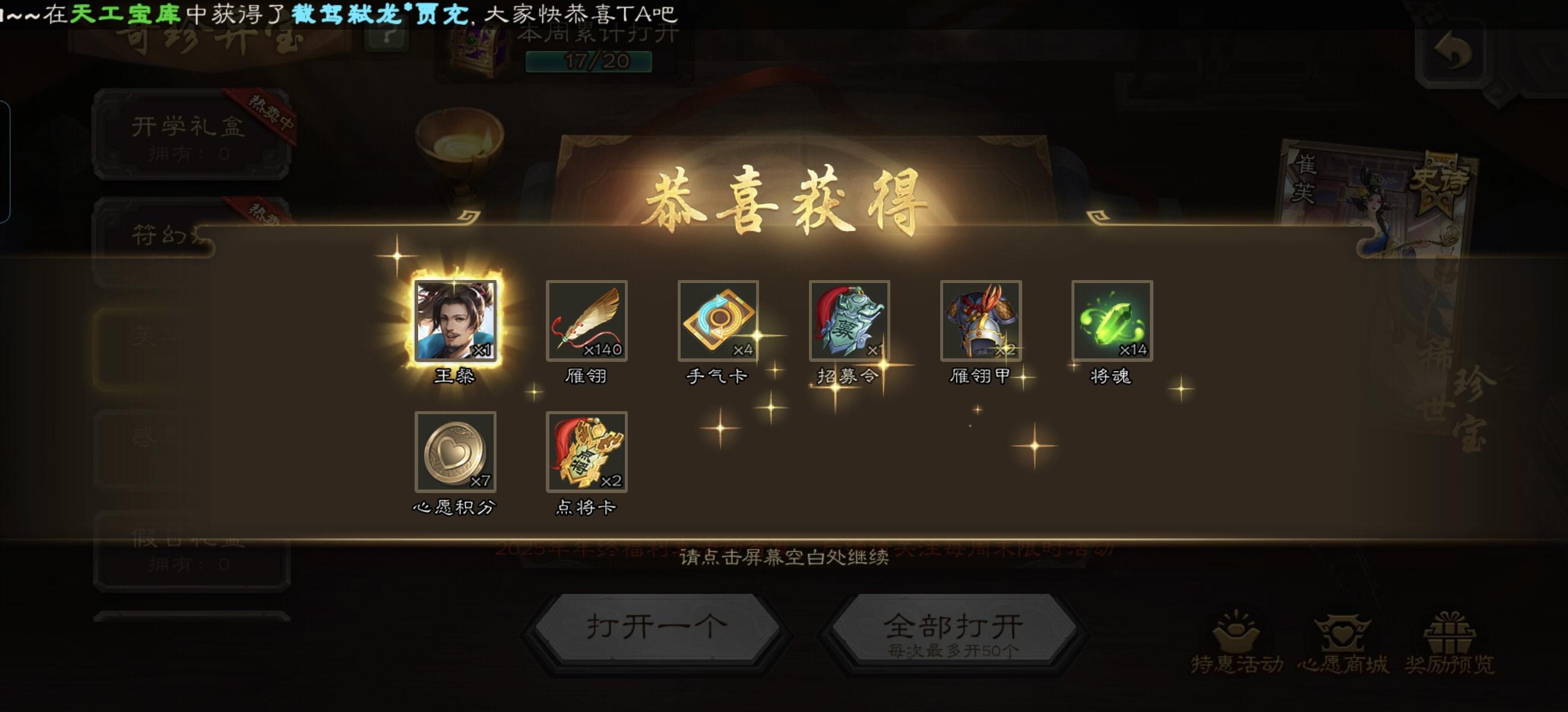 谋陈宫上线,2023年S7-S9赛季排位达到大师段位获得 龙争虎斗*夏侯惇上线,2023年S7-S9赛季排位赛黄金段位获得 奋勇杀敌*于禁上线,2023年7-9月公会团战奖励 公直规行*杨阜上线,7月银币兑换获得 欲谋自立*钟会,缮甲治兵*陈到,与民同乐*张恭开放合成、分解,加入雁翎甲奖池 界周仓开放合成,分解,加入招募令奖池 一、新赛季,新征程 时间:7月1日-7月7日 内容: (1)新赛季登