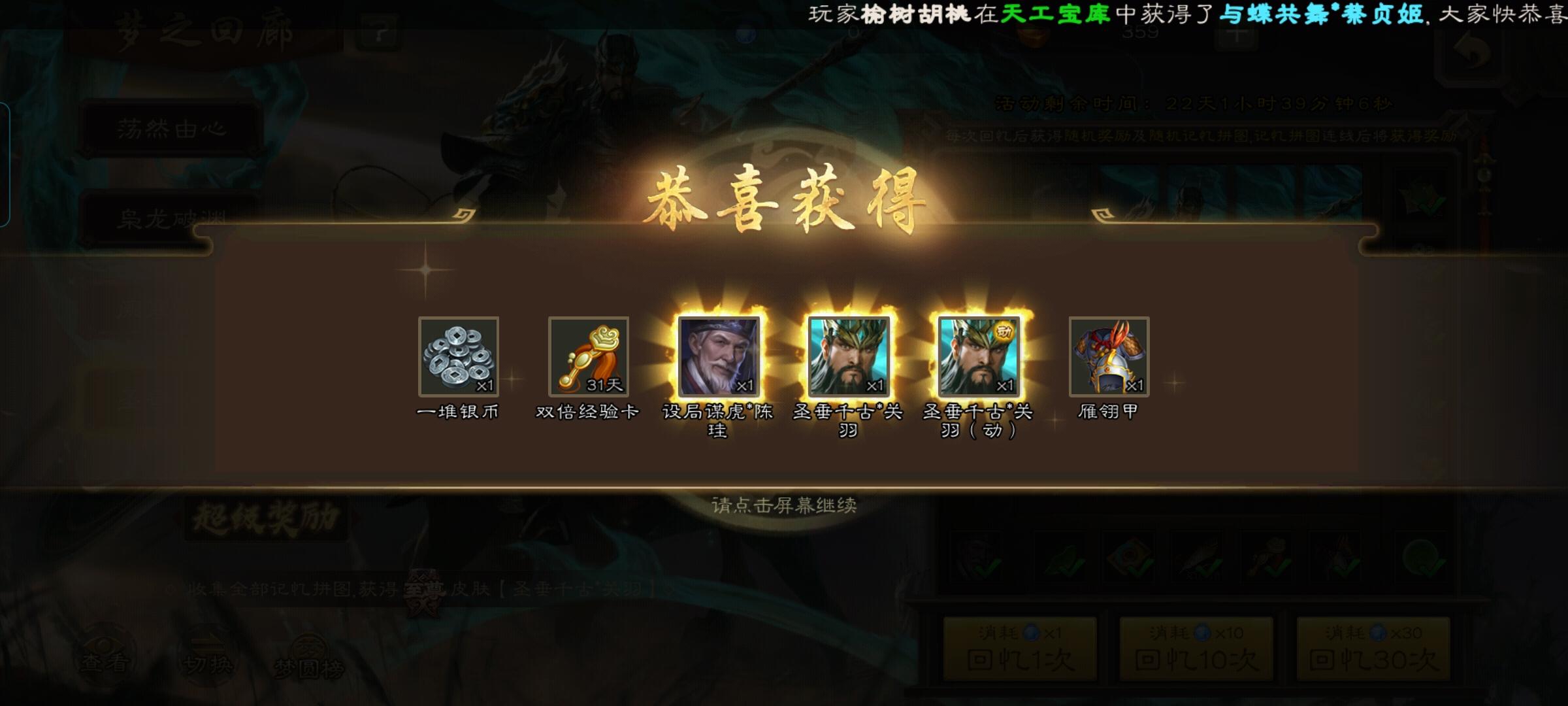 睥睨天下*曹叡上线,梦之回廊获得 扶危济困*张仲景上线,梦之回廊获得 谋法正上线,天工宝库获得 大智若愚*刘禅上线,天工宝库获得 花团锦簇*糜夫人上线,天工宝库获得 蓄势待发*郭淮上线,天工宝库获得 人面桃花*杨婉上线,史诗体验卡兑换 前后两难*孙尚香上线,夏日狂欢签到活动获得 乐善好施*袁涣开放合成、分解、加入雁翎甲奖池 明良千古*黄忠开放合成、动态合成 一、新版本礼包 时间:6月3日-6月9日