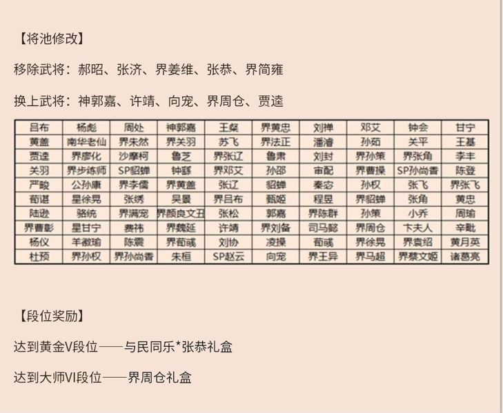 声明:作为一名非专业的排位玩家,我所聊的只是个人看法。跟老水的专业帖不能比。 首先我们来看看,换下的武将与换上的武将对比。 移除:张济、郝昭、张恭、界姜维、界简雍。 这五个里面有四个都是排位好手(界简雍感觉不咋地)而且张济、张恭、界姜维都是平民能够获得的武将。 张济只要起手有装备或者队友属于包养辅助型武将,每轮稳定一顺手,运气好还能给你来个狼袭。不可多得的西凉军【阀】头子。 张恭看似卖血流,但是集