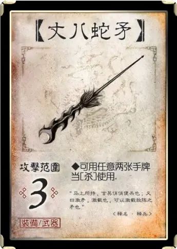 三国杀中的武器除了最热门的诸葛连弩外,其他武器难分高下,不过不管怎么排丈八蛇矛应该都在前列。作为一个3距离的武器,在军八场上算是一个不错的武器了,特别是可以将两张手牌当作一张杀使用的特性,更是赋予了它独特的技能以及超群的武将技能契合度。 丈八蛇矛原本是张飞的武器,张飞在游戏中拥有一个“咆哮”技能,可以无限出杀。对于张飞而言唯一害怕的就是没有足够的【杀】,那么丈八蛇矛就能够弥补了缺【杀】的特性,只要
