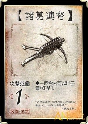 三国杀移动版军争一副牌,到底有多少张武器牌以及每张牌的效果。 这个问题,可能大家平时根本不关注,或者说,因为太熟悉了,所以没必要关注。就像突然问大家三国杀一共有哪几种防具,还真不一定能答上来。 但其实,这个不仅是基础知识——更是进阶的必备。比如你在斗地主的时候,通过对手的弃牌,猜测出了牌堆里面还剩几张武器,几匹马或者几个防具,那么胜算就会大大增加。 话不多说,干货来袭! 诸葛连弩 诸葛连弩应该是三