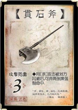 武器牌在三国杀里发挥了很大的作用,装备武器后不仅能增加攻击距离,而且相当于让自己多了一个技能。不同武器牌的功能差异很大,对局中发挥出的作用是不一样的。下面就给大家带来玩家们心中的最强武器排名,看看和你的预期是否一样。 一、贯石斧:强命神器 强制命中是三国杀里很关键的一项能力,而具备这项能力的只有极少数武将,比如谋马超、界黄盖、还有黄忠等。拥有这项能力意味着可以稳定输出,配合增伤秒人相当的丝滑。贯石