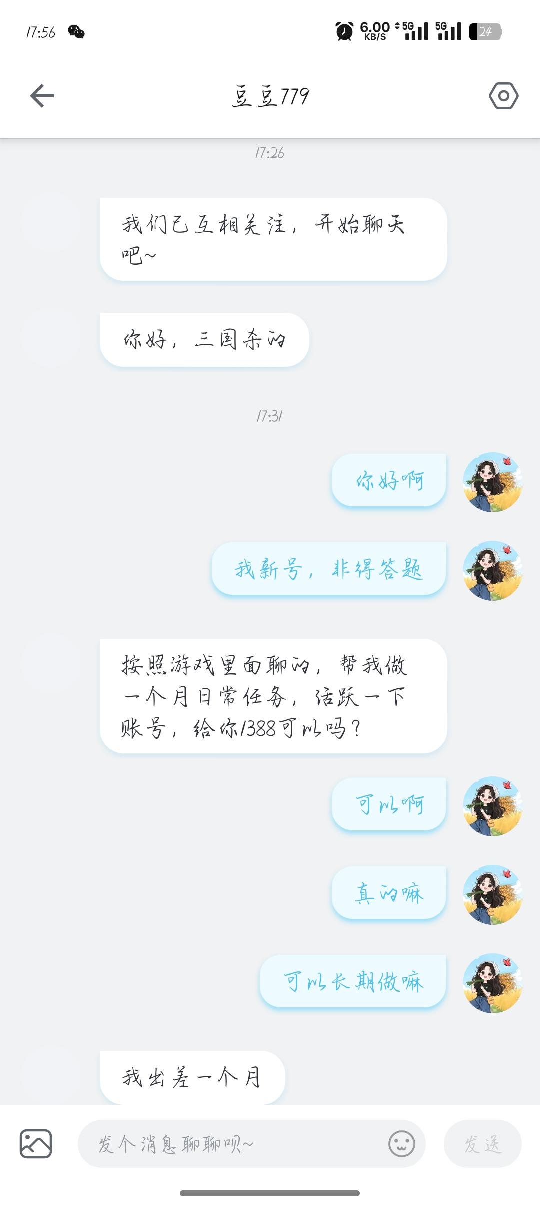 曝光诈骗犯🈲🈲🈲就是我图片里的这个人。我我随便进的一个8人房间,然后玩了好几把,最后大家都下线了。我发现有人加我好友。通过聊天得知他想要我帮他活跃账号,说一个月给我1388。然后我说加徽,他说不方便,让我加他的哔哩哔哩,说不放心可以走平台。让我去某鱼发布闲置代练单子。然后他做了一个某鱼官方客服平台接代练的网站,用二维码形式发给我让我扫,后面就是我发的图3的界面,让我交什么保障金。还好我之前