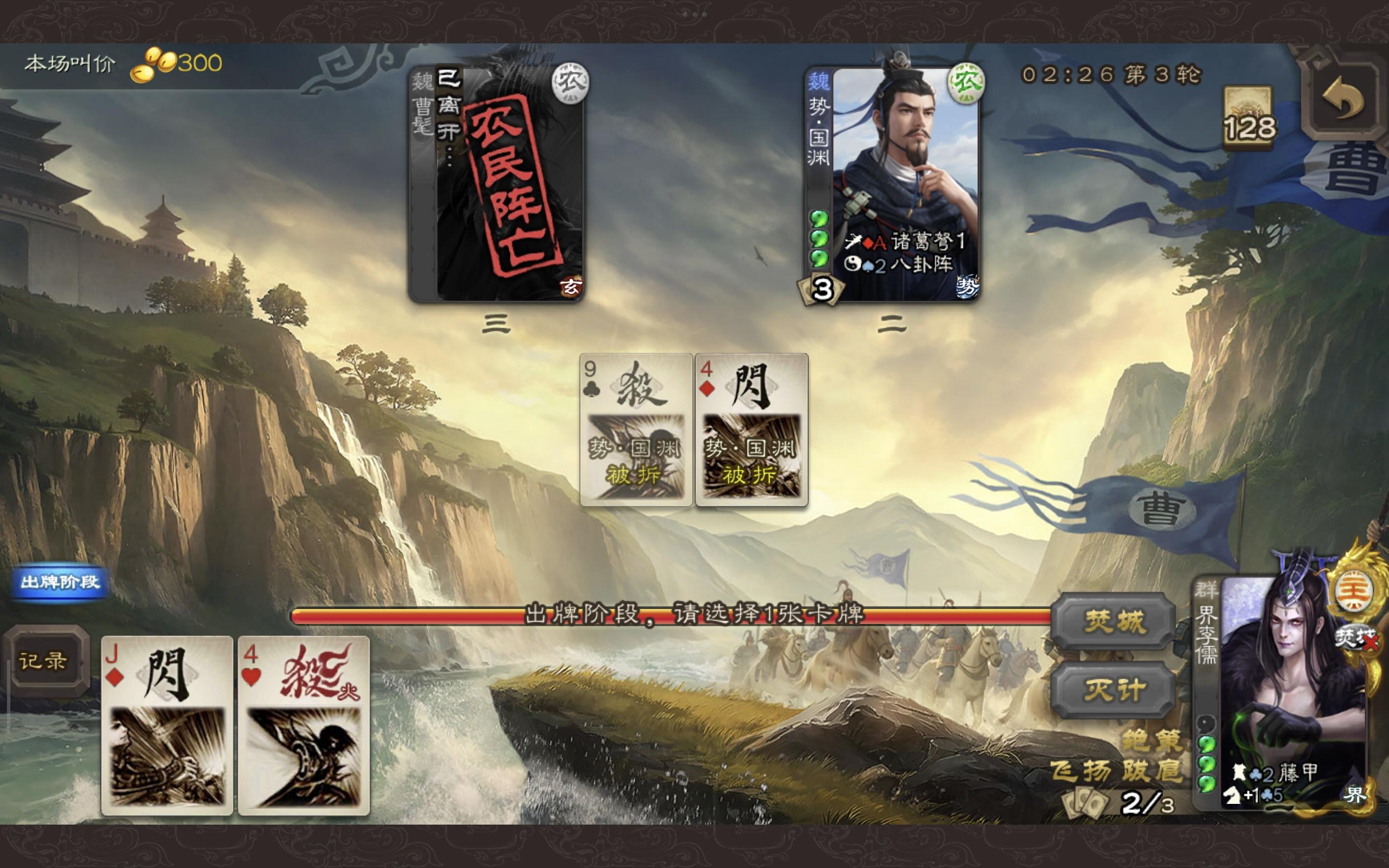 守门员是曹耄和果园,开局两顺手加三杀连弩秒毛子,后面狂耗果园5个回合,藤甲无敌