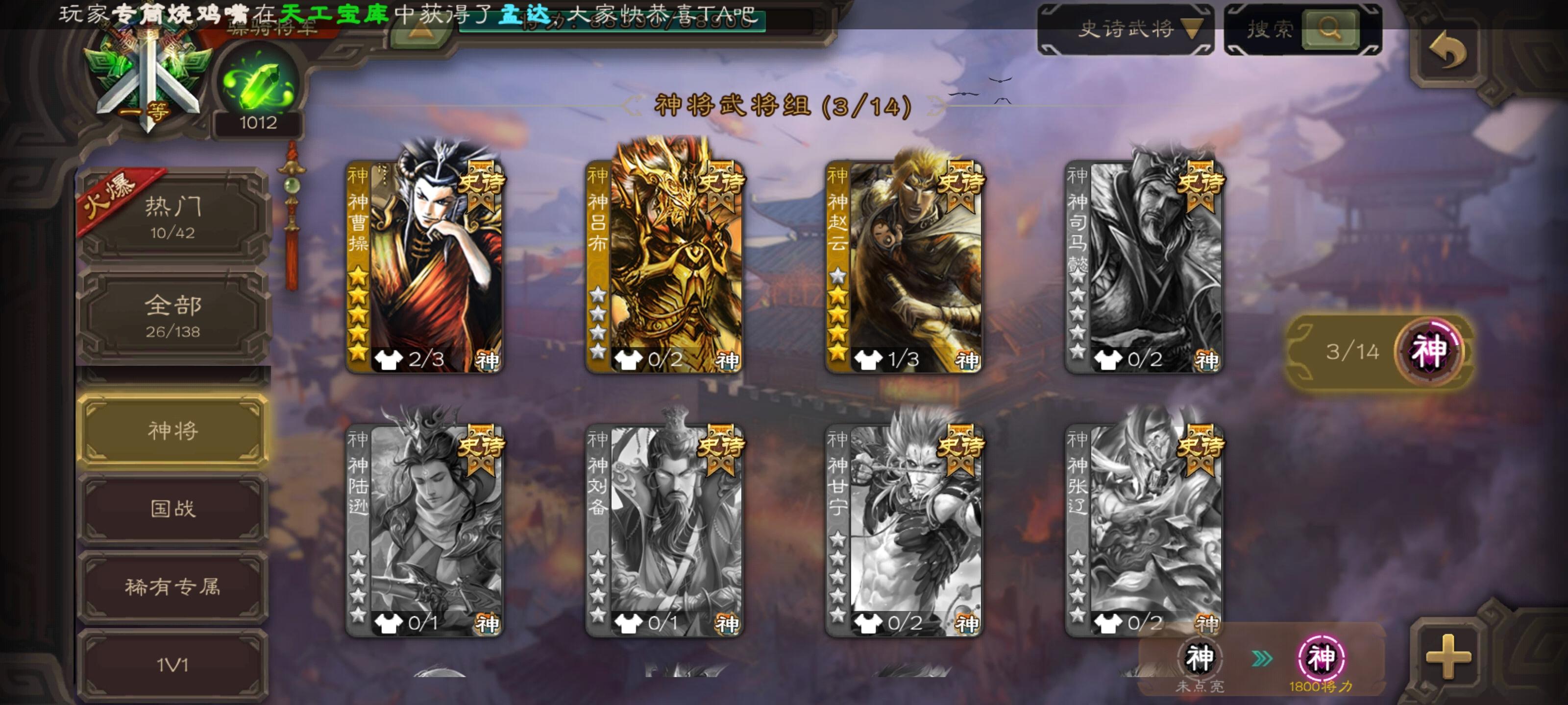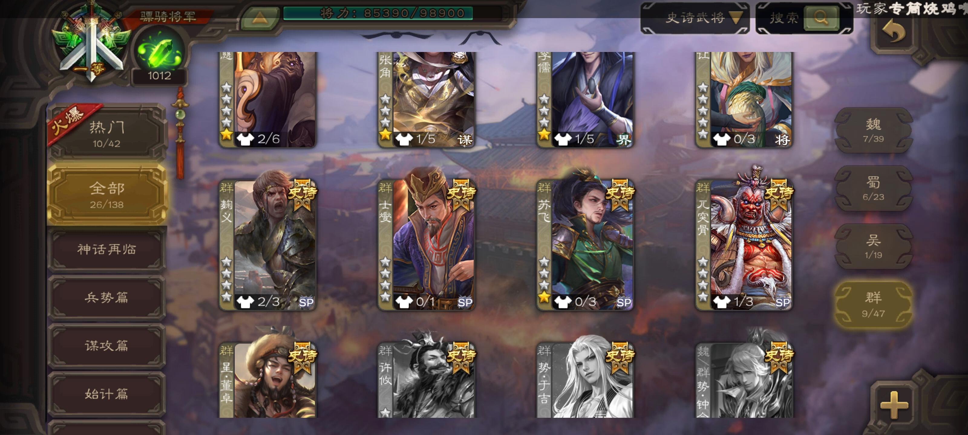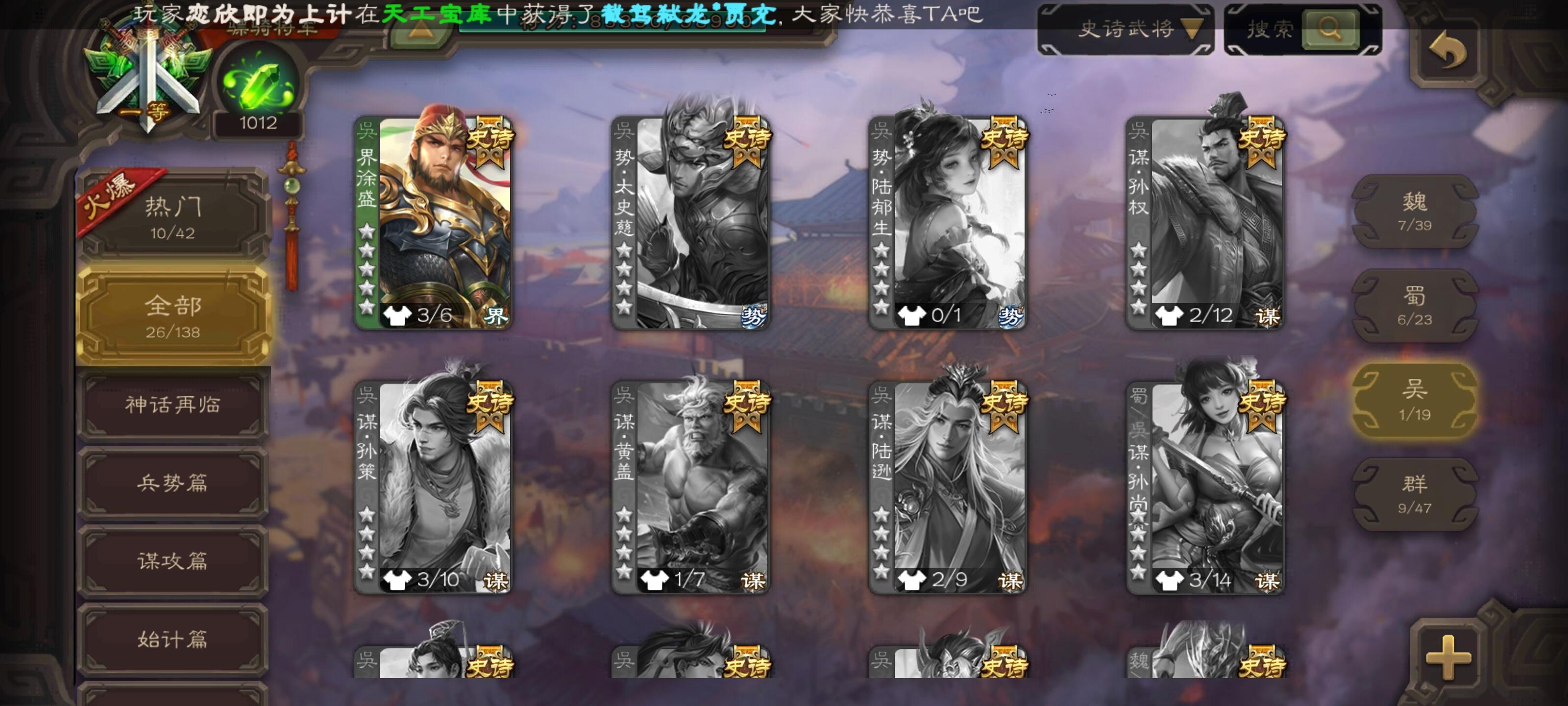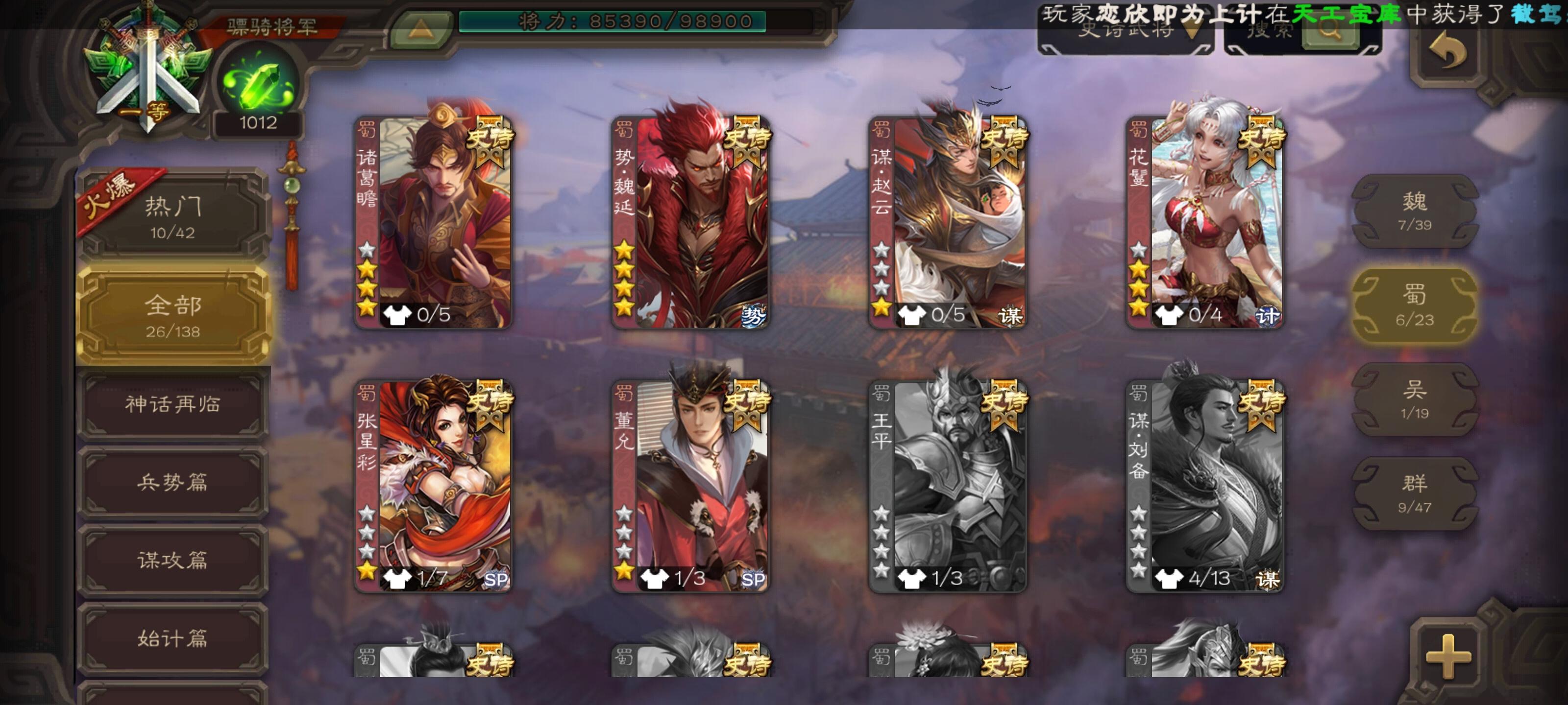 自玩的,东西不多,有神司马、十常侍、大宝,其他史诗十多个,神赵,戏子和一些盒子开出来的史诗,有点用但是没那么强。皮肤神赵和司马有动皮,还有几个盒子开的和活动给的动皮,材料方面,将魂有6q,羽毛3w,珠子剩4个,其他的材料都有一些但是不多我感觉我这号也就这些东西了,各位将军看看能出多少