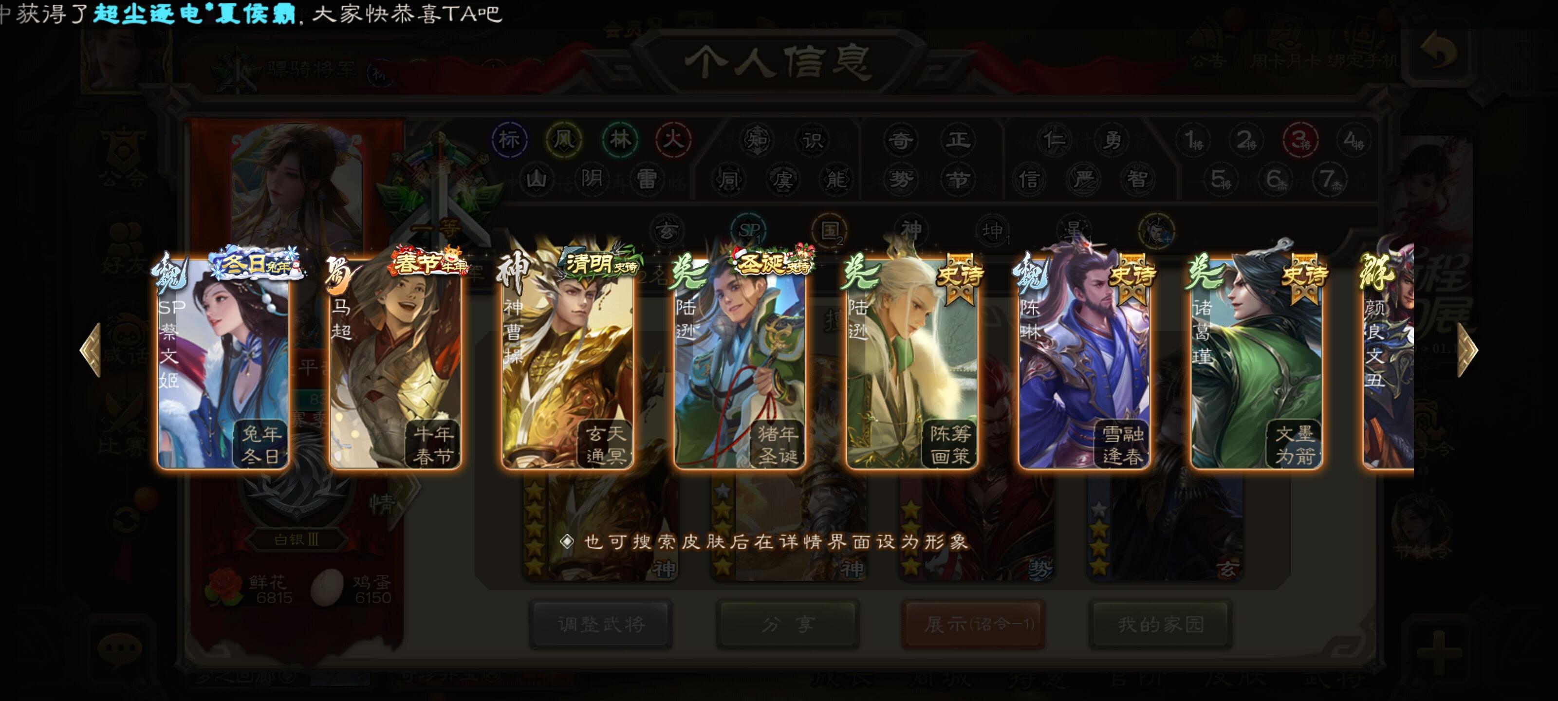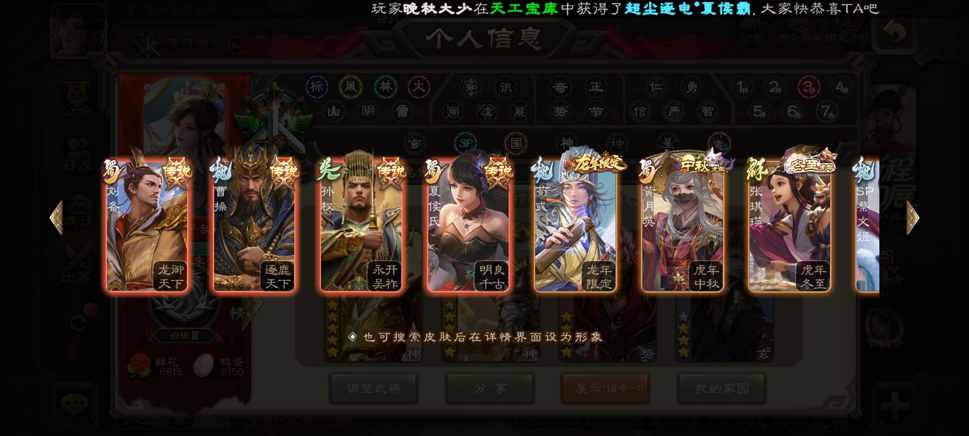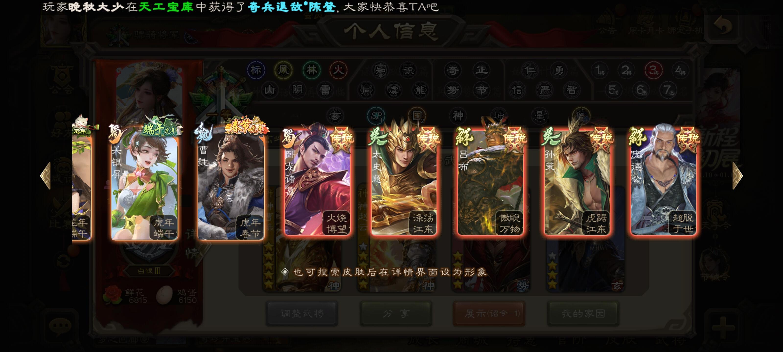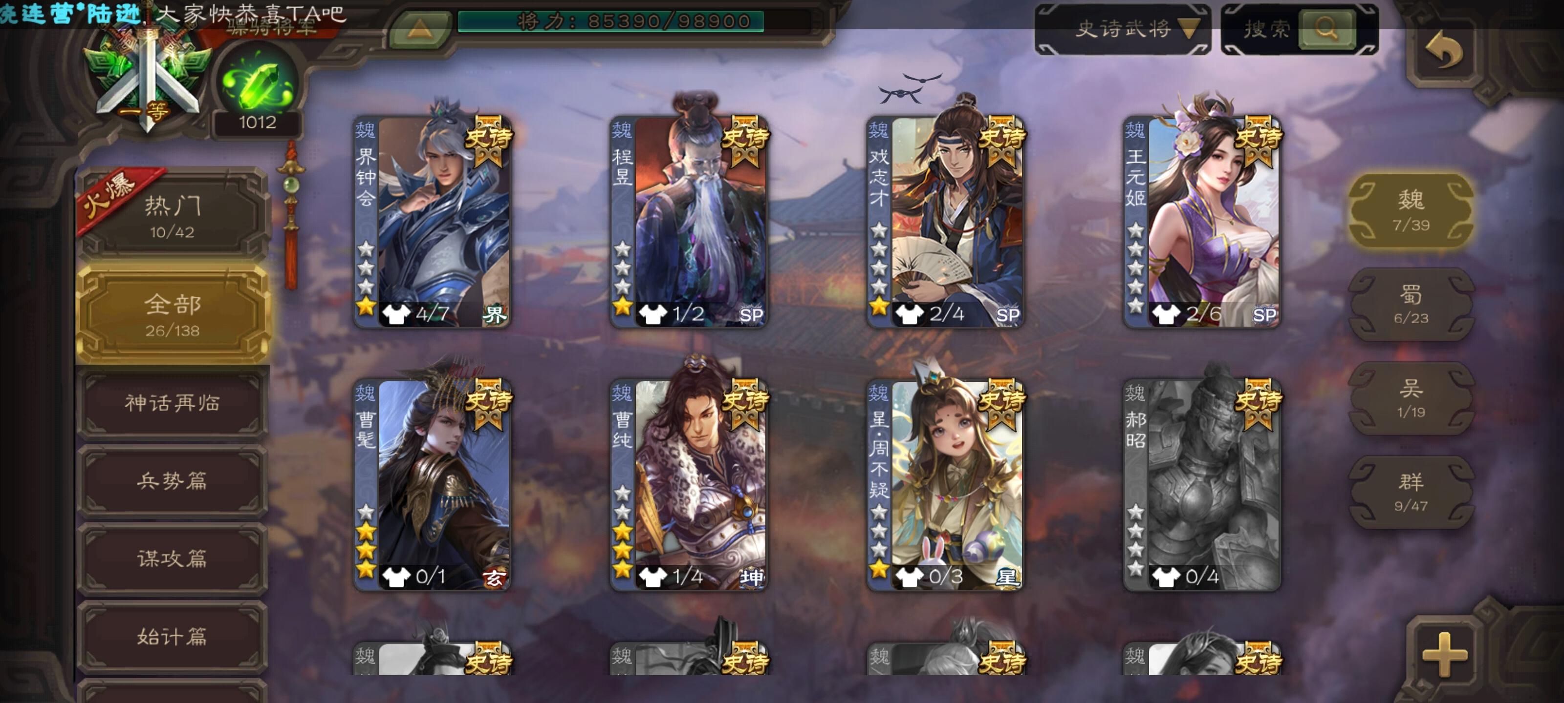 自玩的,东西不多,有神司马、十常侍、大宝,其他史诗十多个,神赵,戏子和一些盒子开出来的史诗,有点用但是没那么强。皮肤神赵和司马有动皮,还有几个盒子开的和活动给的动皮,材料方面,将魂有6q,羽毛3w,珠子剩4个,其他的材料都有一些但是不多我感觉我这号也就这些东西了,各位将军看看能出多少
