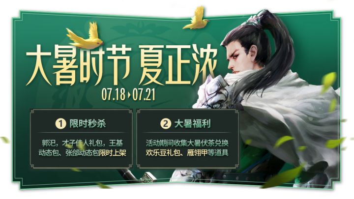 镇守江陵*朱然上线,开放合成,大暑活动获得一、大暑好礼时间:7月18日-7月22日内容:(1)大暑登录礼活动期间,3.8.5版本及以上的50级以上玩家每日登录可在特惠中心领取大暑福利第1日(7月18日):大暑伏茶*1+欢乐豆礼包*1第2日(7月19日):大暑伏茶*1+点将卡*3第3日(7月20日):大暑伏茶*1+换将卡*3第4日(7月21日):大暑伏茶*1+手气卡*3第5日(7